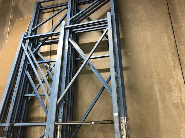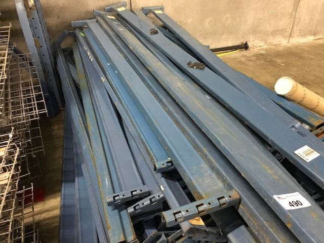 LARGE LOT OF INDUSTRIAL HEAVY DUTY RACKING INCLUDING 12 VERTICAL UPRIGHTS, APPROX 50 LATERAL BEAMS AND METAL MESH SHELVING. MUST TAKE ALL