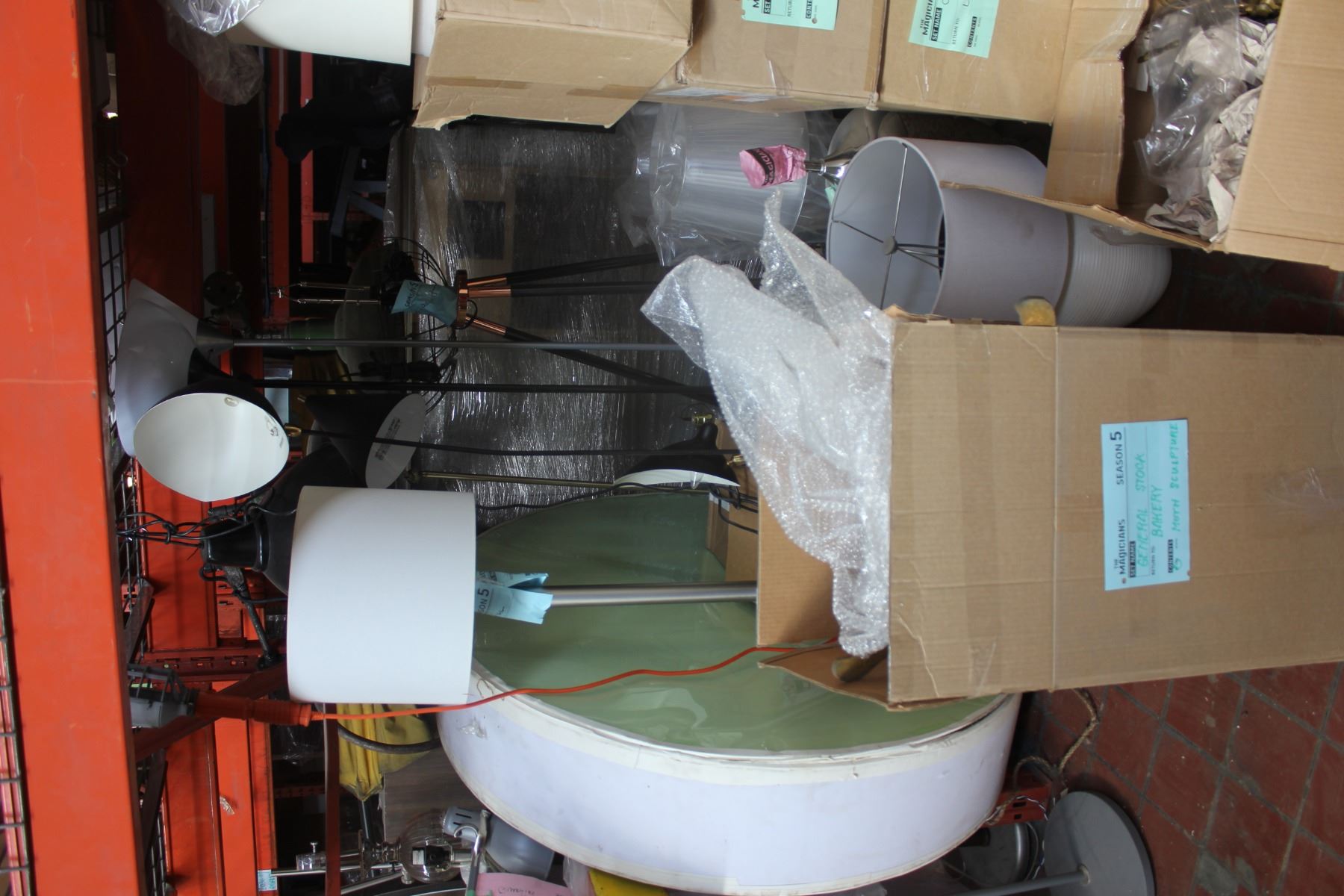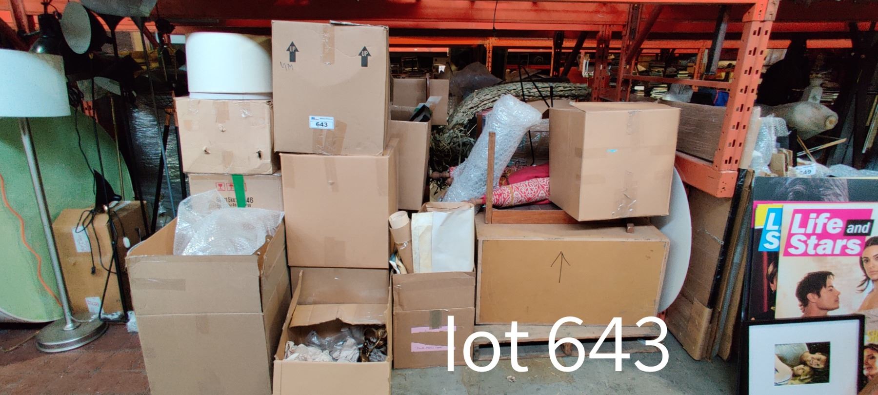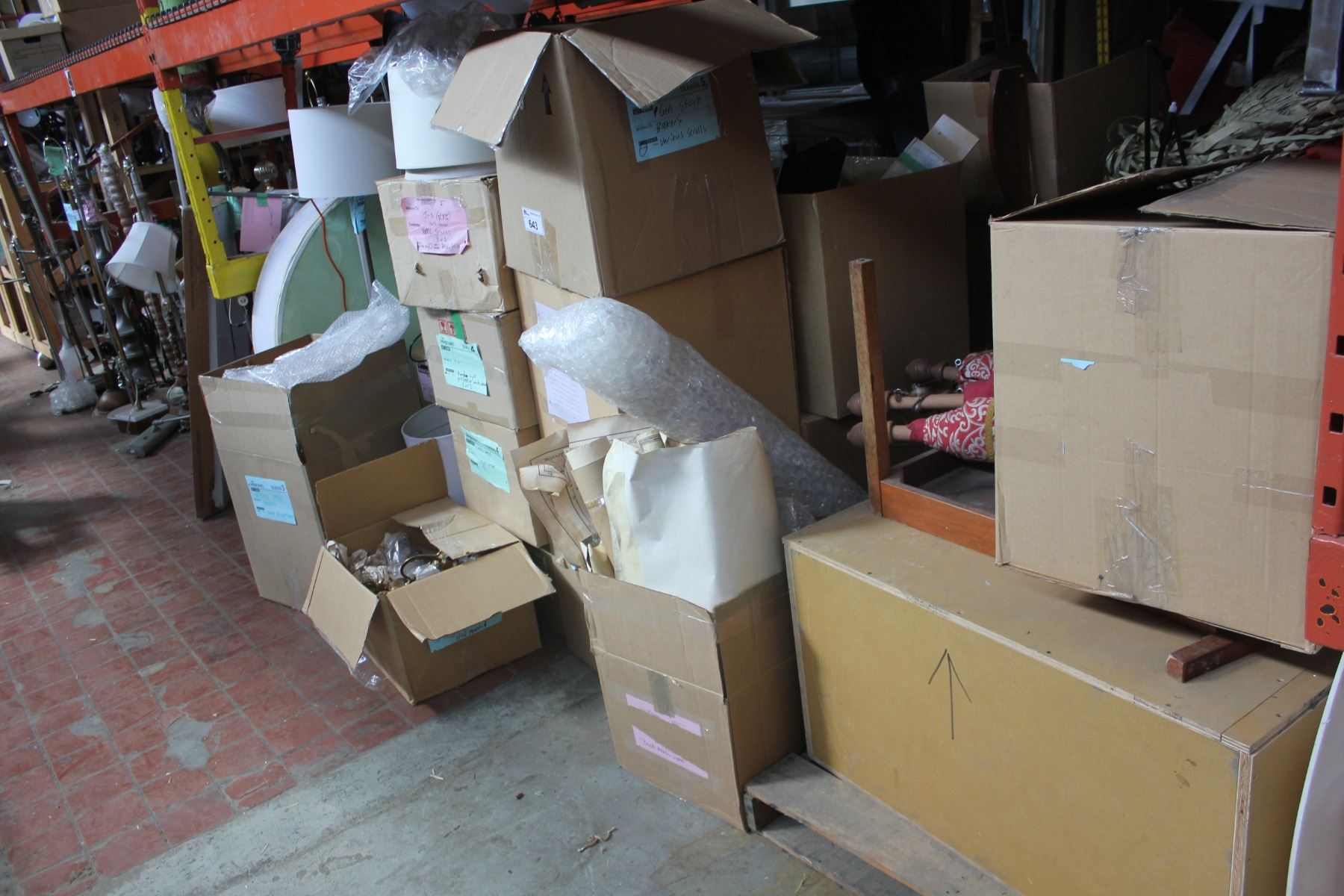 LARGE LOT OF MISC MOVIE SET BOXED ITEMS UNDER PALLET RACKING