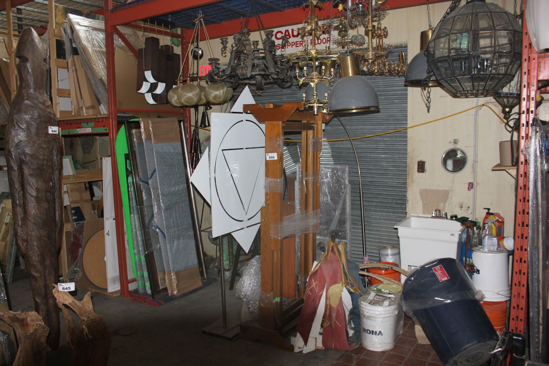 LARGE LOT OF MISC MOVIE SET ITEMS INCLUDING LIGHT FIXTURES, MIRRORS, AND MORE UNDER PALLET RACKING
