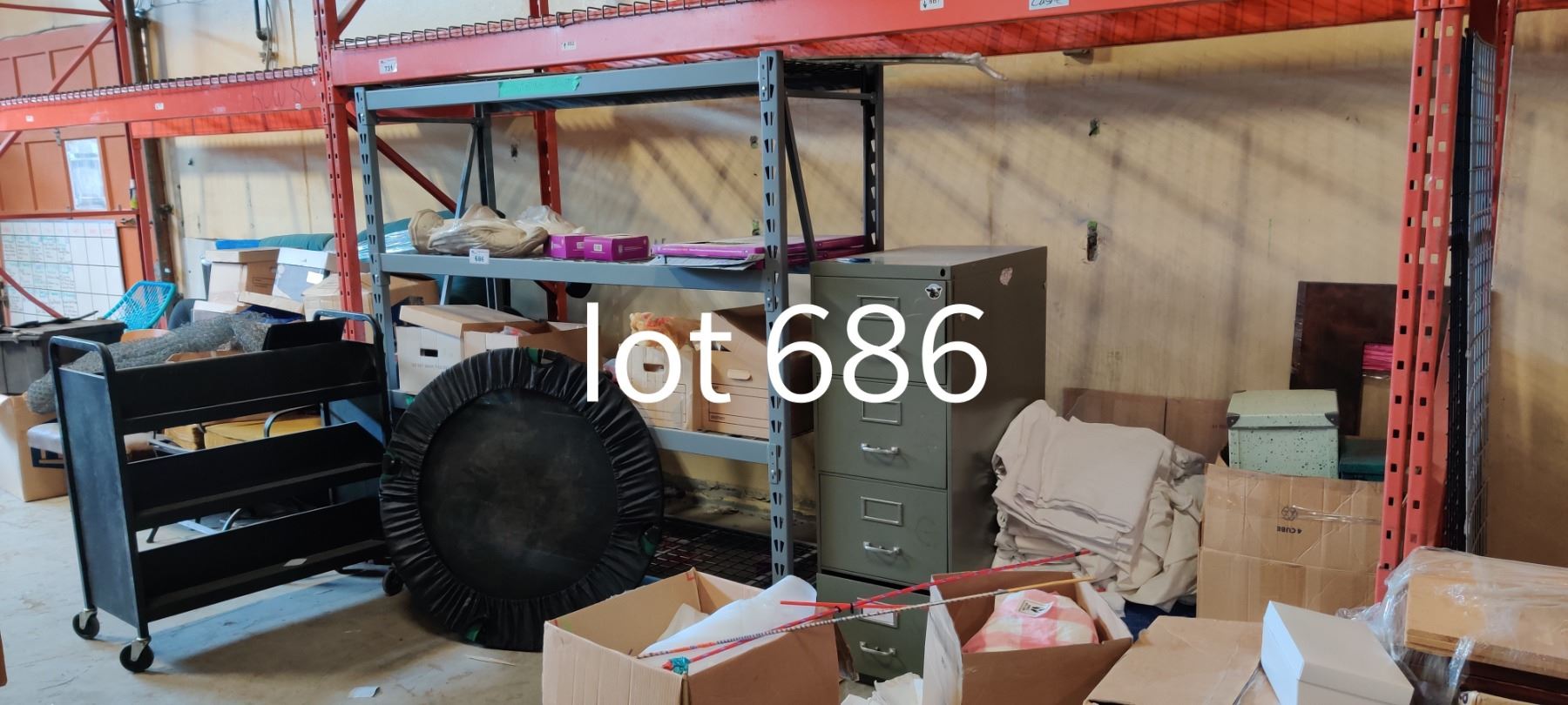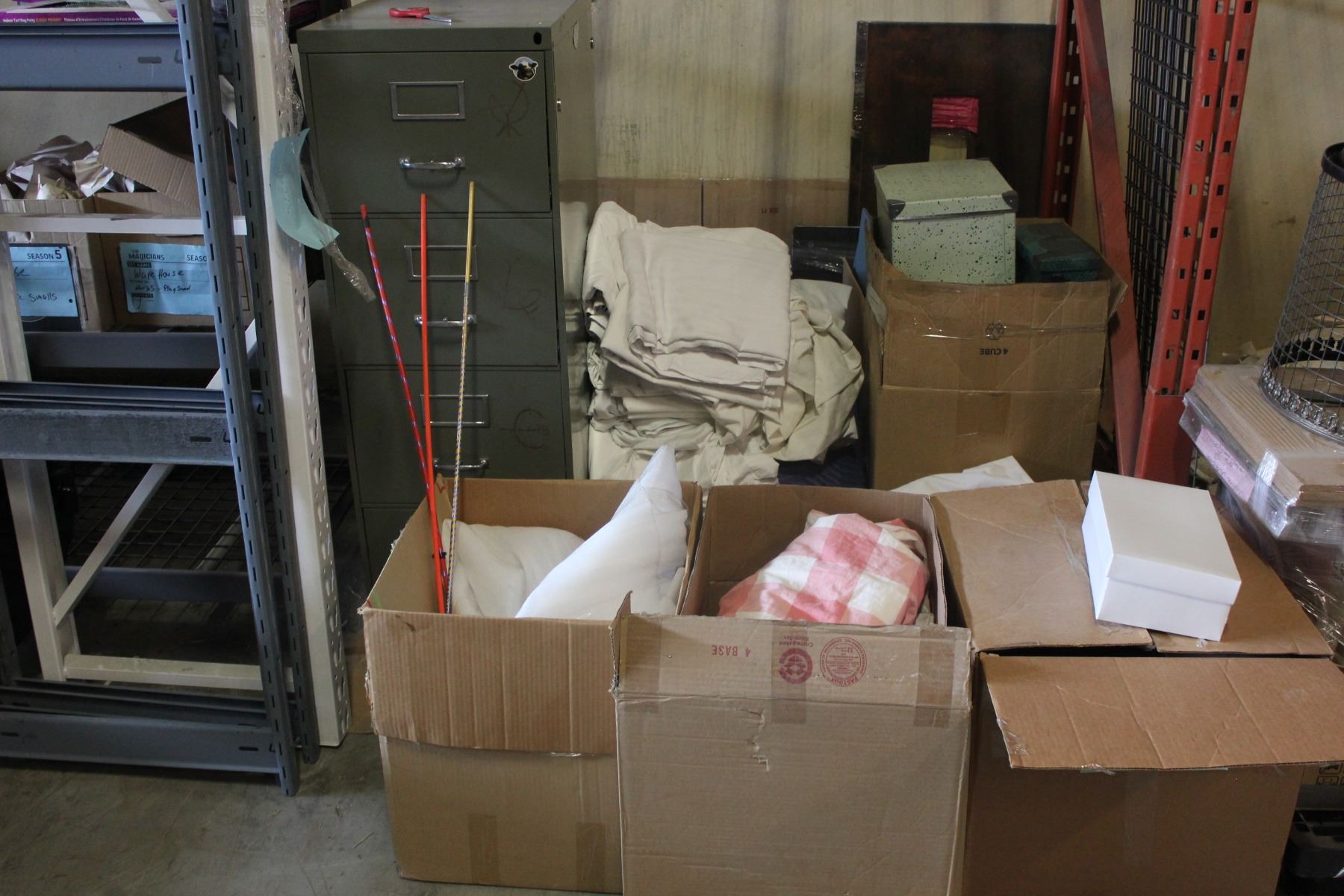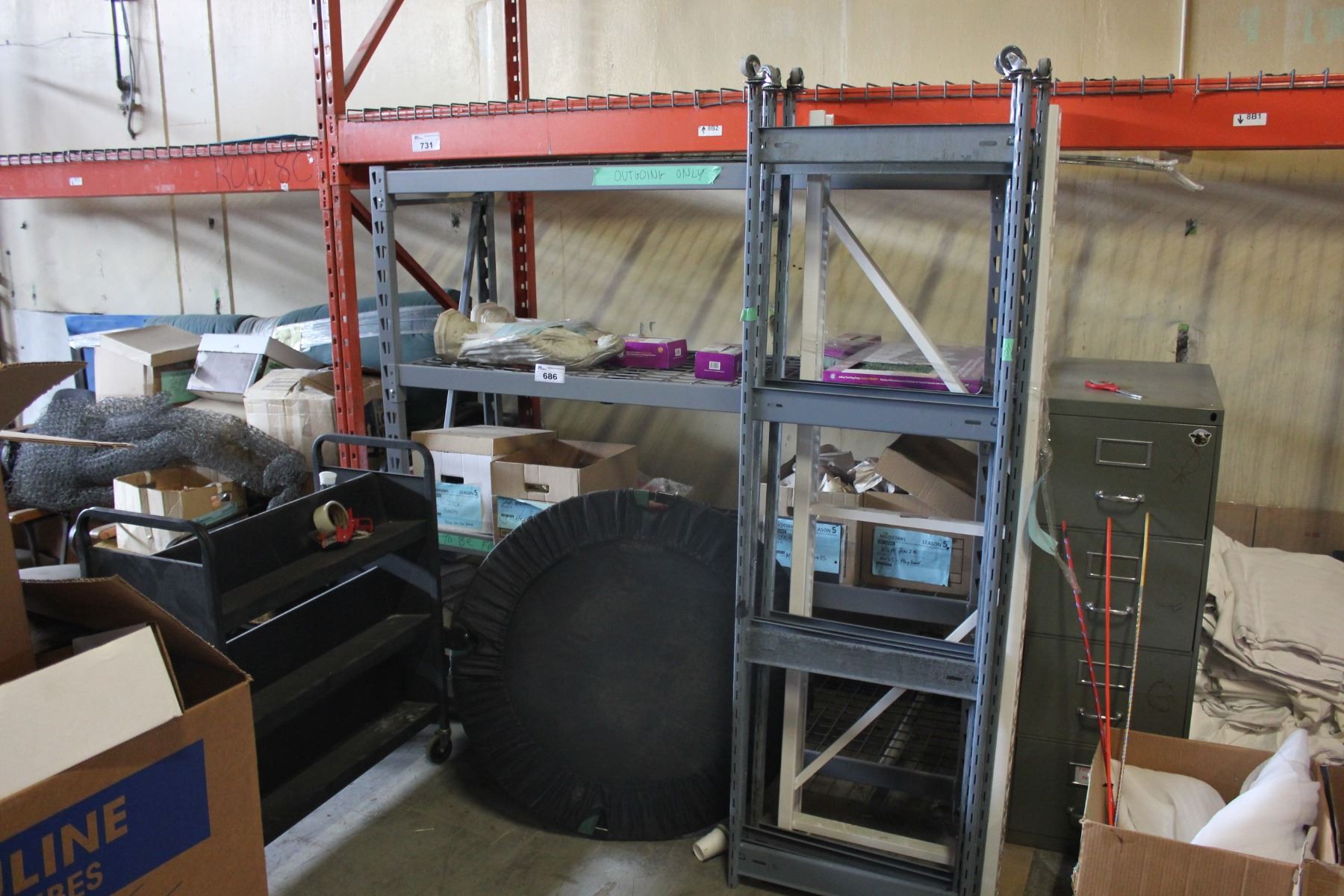 LARGE LOT OF MISC MOVIE SET ITEMS UNDER PALLET RACKING INCLUDING SHELVING UNIT, TRAMPOLINE, FILE CABINET AND MUCH MORE