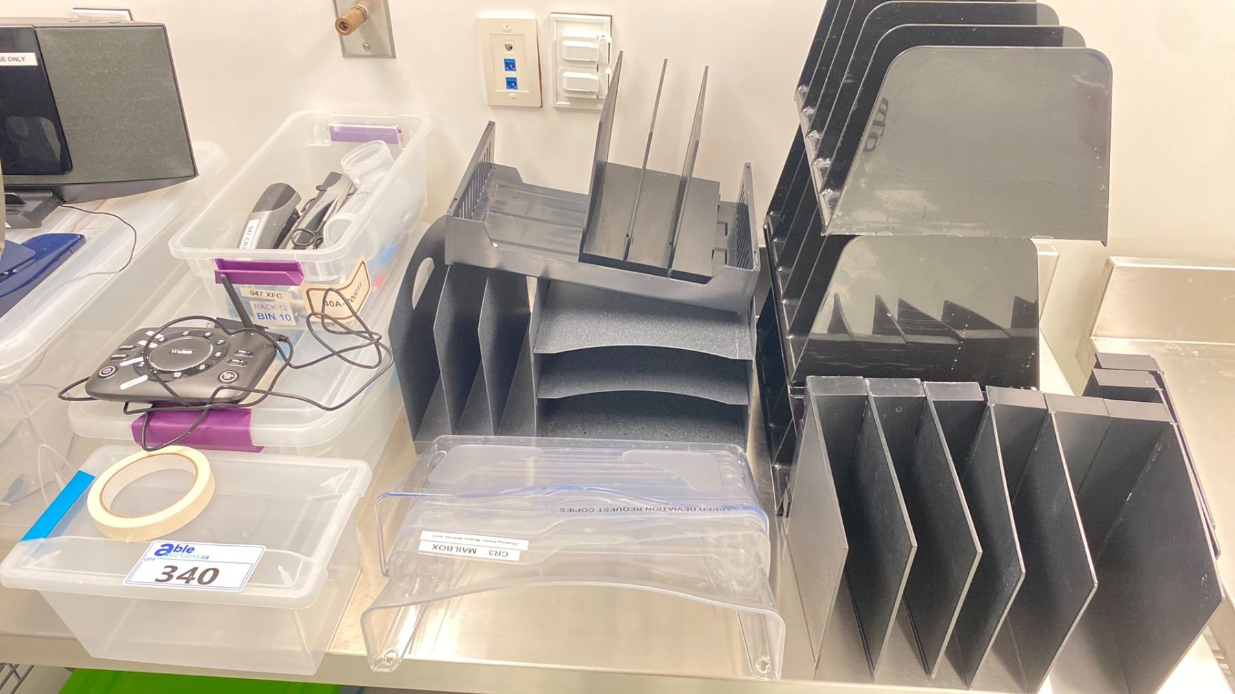 LARGE LOT OF OFFICE SUPPLIES; SEVERAL FILE ORGANIZERS, SONY SPEAKER DOCK, WULOO INTERCOM, LABLES AND MUCH MORE