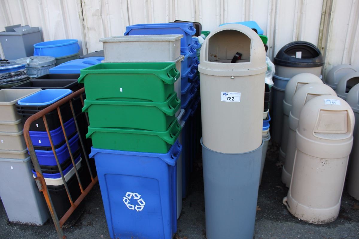 LARGE LOT OF RECYCLE BINS AND GARBAGE CANS