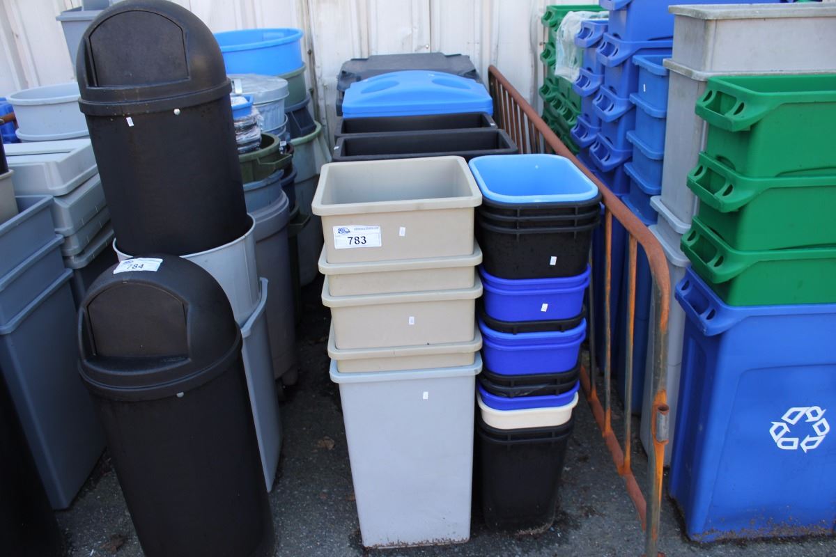 LARGE LOT OF RECYCLE BINS AND GARBAGE CANS