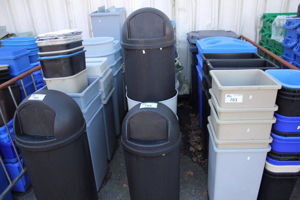 LARGE LOT OF RECYCLE BINS AND GARBAGE CANS