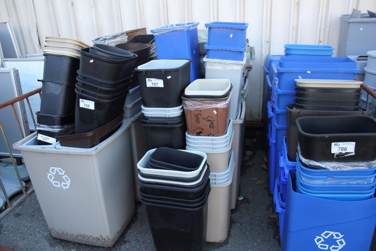 LARGE LOT OF RECYCLE BINS AND GARBAGE CANS