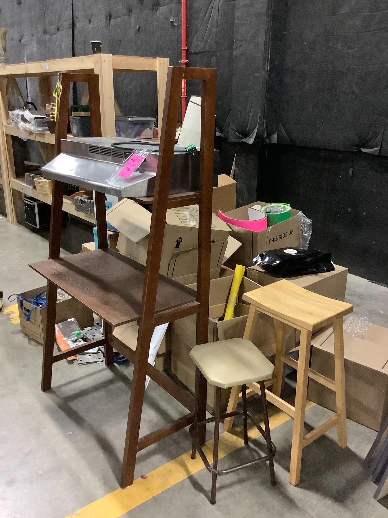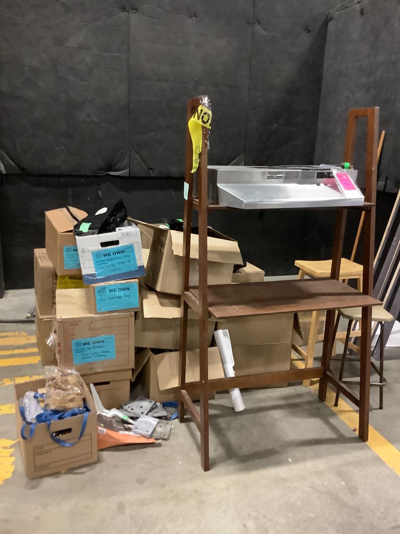 LARGE LOT OF SET DEC ITEMS INCLUDING; SHELVING UNIT, HOOD FANS AND MUCH MORE