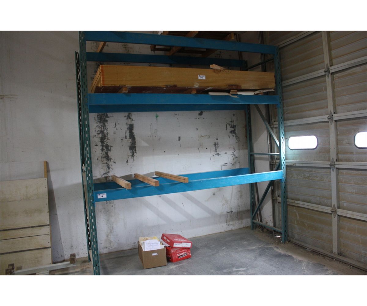 LARGE LOT OF SHEET WOOD AND 2 PALLET RACKS