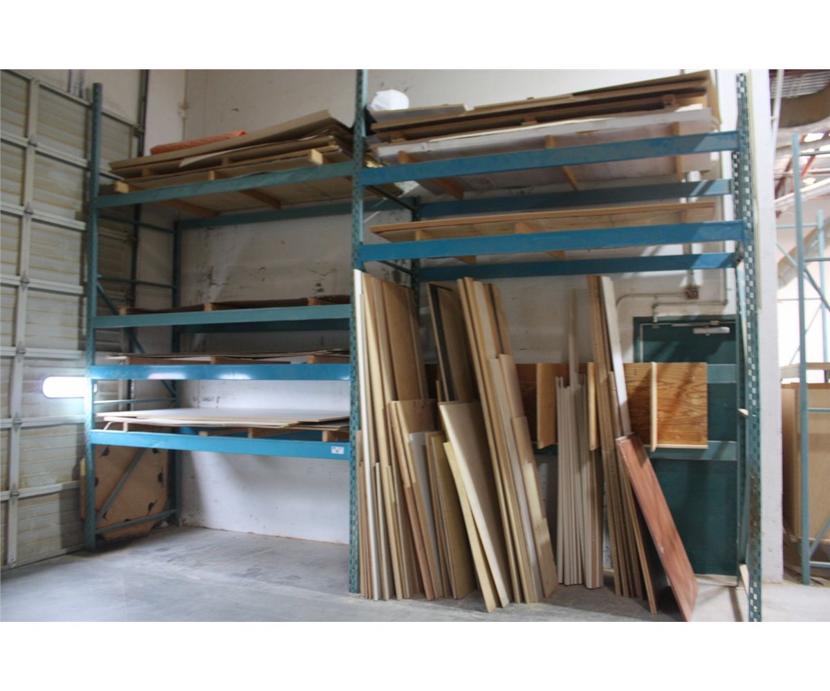 LARGE LOT OF SHEET WOOD AND 2 PALLET RACKS