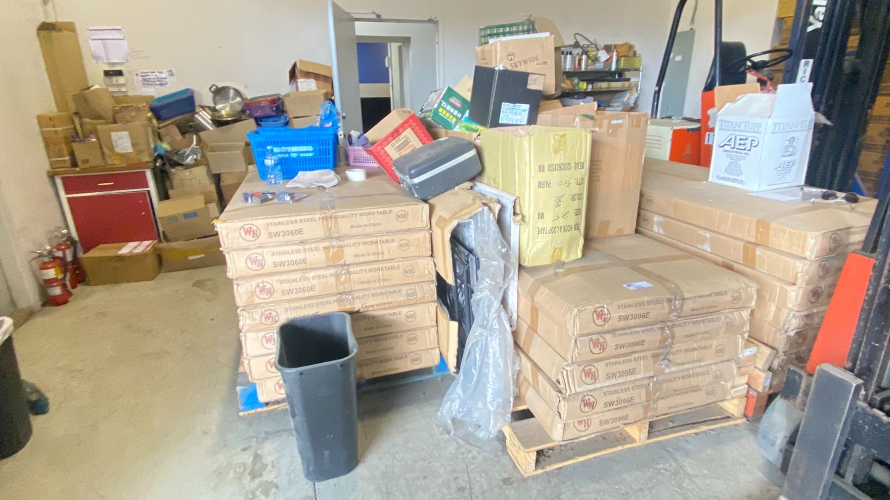 LARGE LOT OF STAINLESS STEEL WORK TABLES, UTILITY KNIVES & MORE *FIRST DAY TO BE REMOVED*
