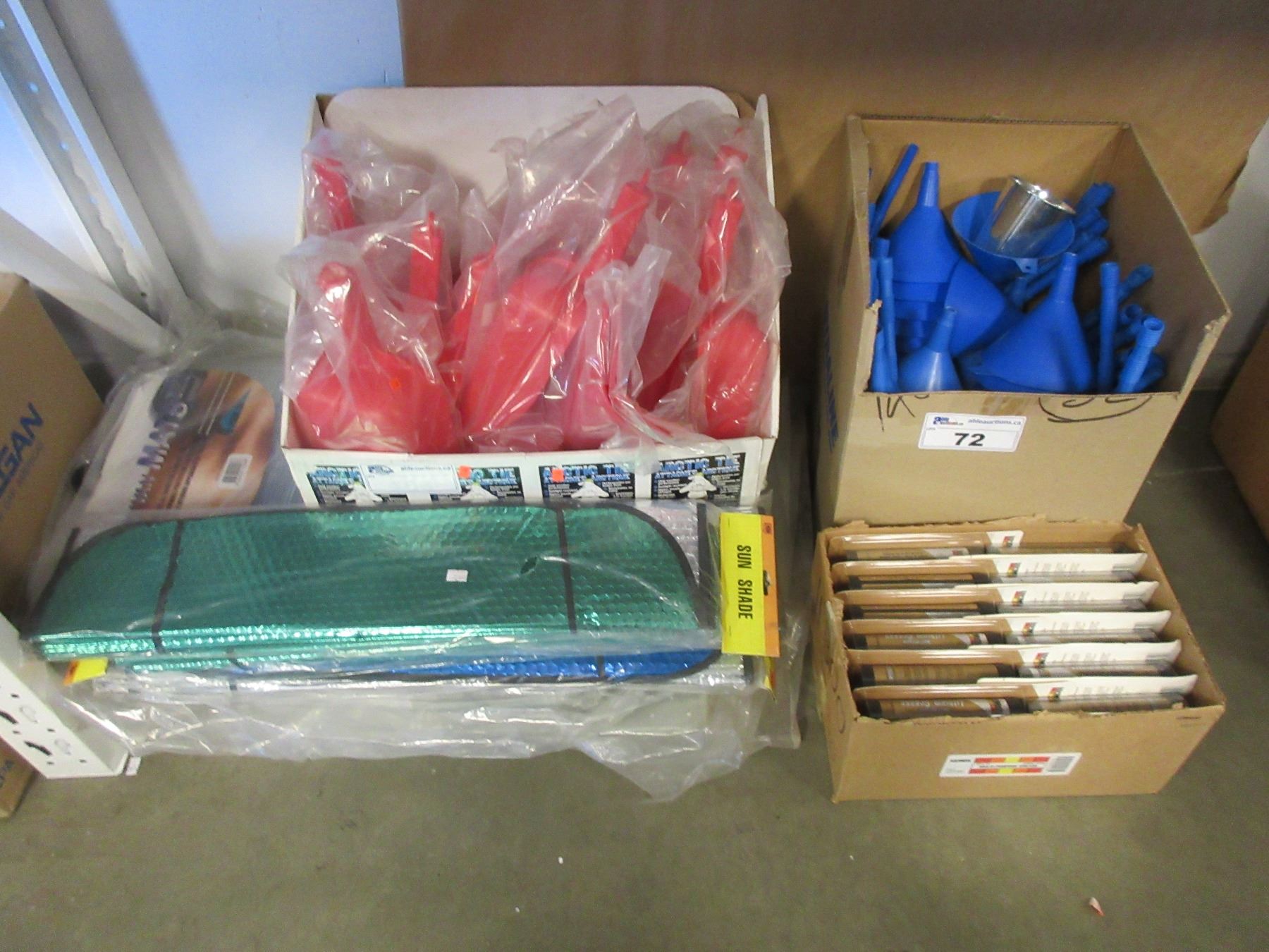 LARGE LOT OF VEHICLE SUN SHADES/VEHICLE FLOOR MATS/SMALL SHOVELS/FUNNELS/GREASE B1