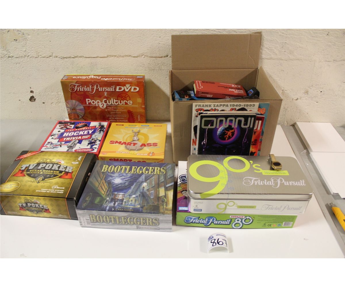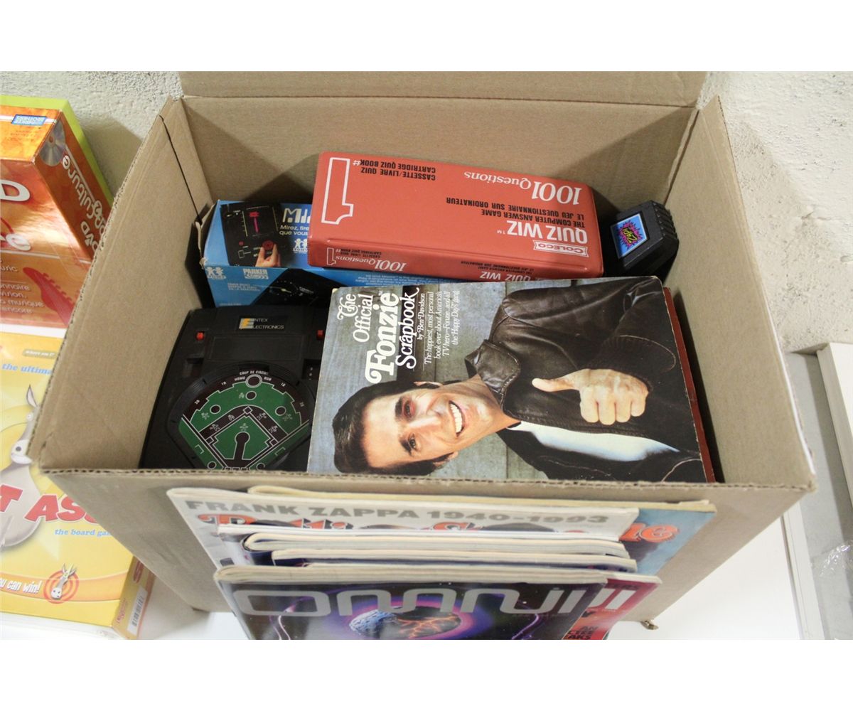 LARGE LOT OF VINTAGE COLLECTABLES INCLUDING PUSH BUTTON LED DIGITAL WATCH FROM 70S, RED DISPLAY (NEW BATTERY INSTALLED) AS WELL AS WORKING ELECTRONIC GAMES (BATTERIES INSTALLED) FROM LATE 70'S & EARLY 80'S (SOME IN BOX) INCLUDING HIT AND MISSLE & BAMBINO BASKETBALL, COLLECO GAMES ZAP & 1001 ?'S QUIZ WIZ AND MORE. ALSO COLLECTION OF BOARD GAMES, SOME STILL SEALED, AND OTHER COLLECTABLES INCLUDING VINTAGE OMNI AND SPY MAGAZINES IN HIGH GRADE.