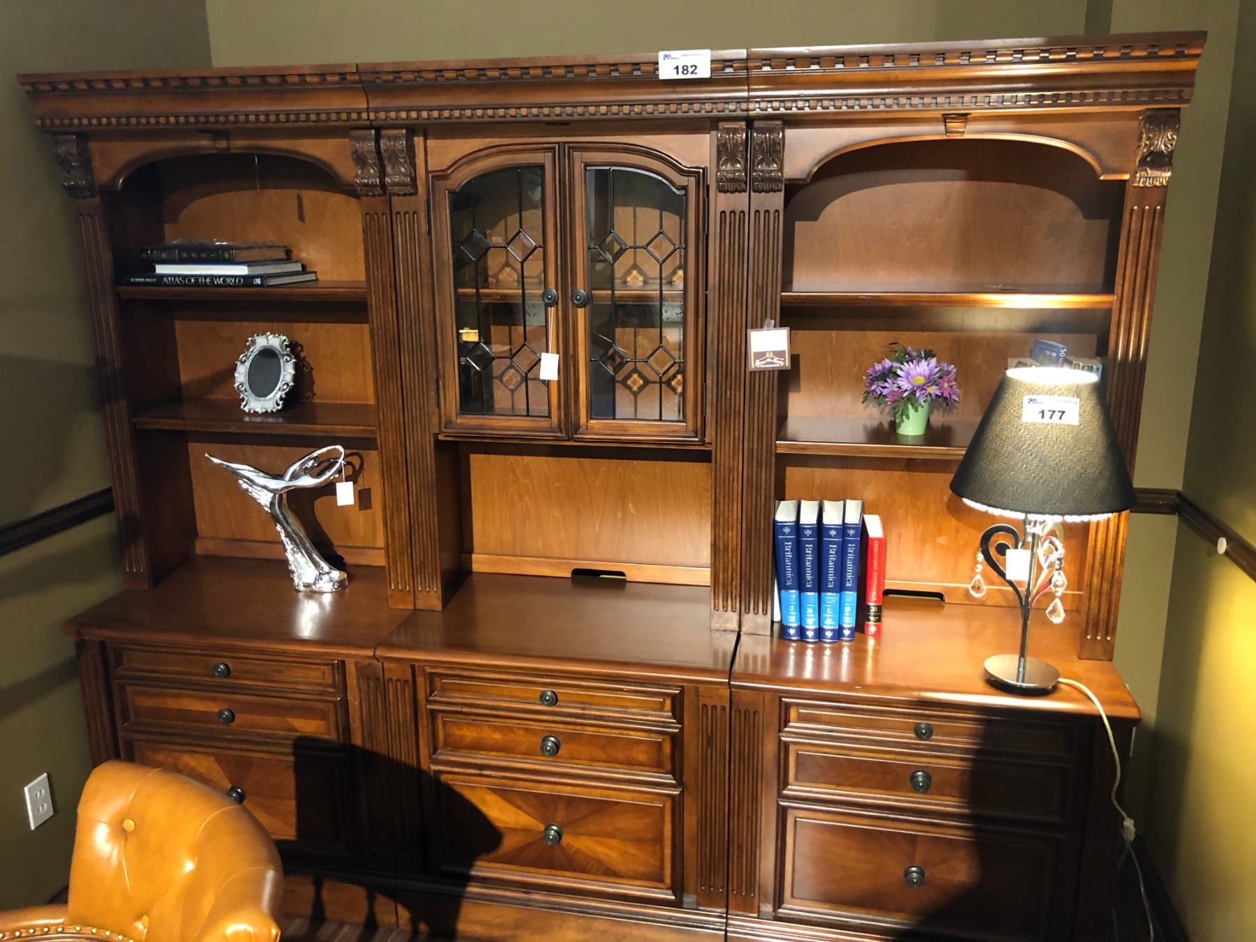 LARGE MED. WOOD WALL UNIT WITH DRAWERS AND GLASS CENTER CABINET. RETAIL $5,680.00