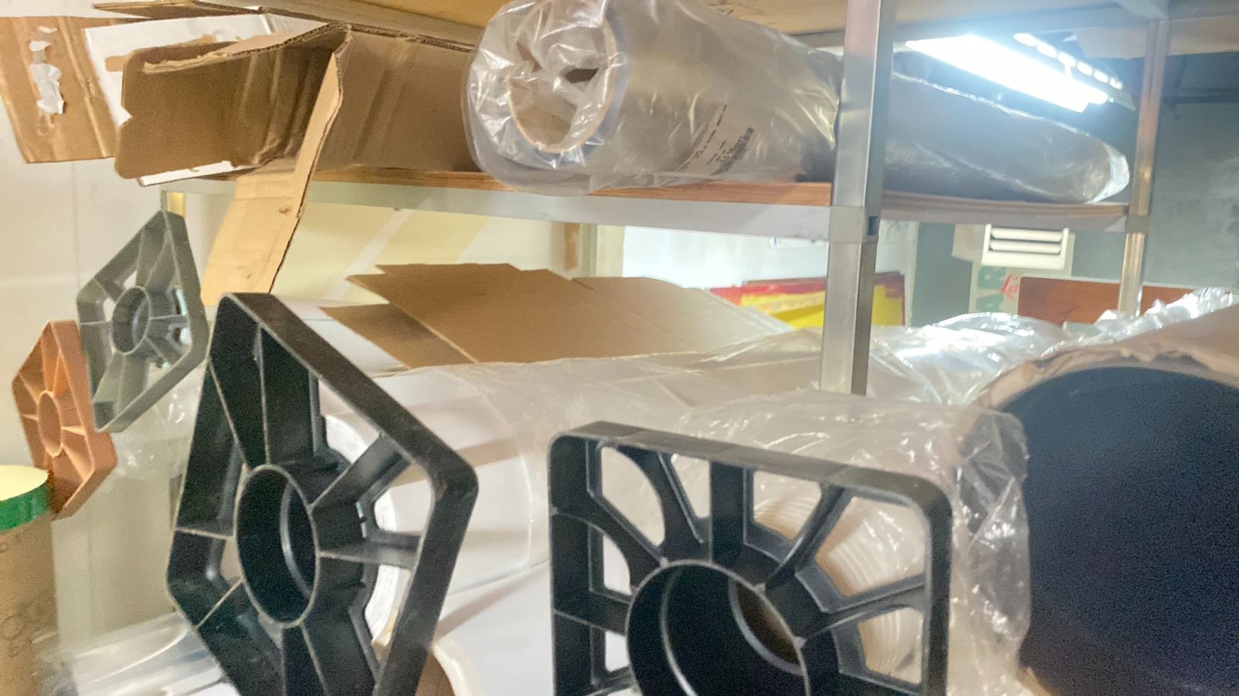 LARGE METAL FRAMED SHELF STORAGE RACK WITH CONTENTS, ALL WHITE INKJET PRINTABLE STOCK, BANNER MATERIAL, DECAL MATERIAL, PAPER MATERIAL - APPROX. 8'W X 8'H X 3'D * LOCATED UPSTAIRS *