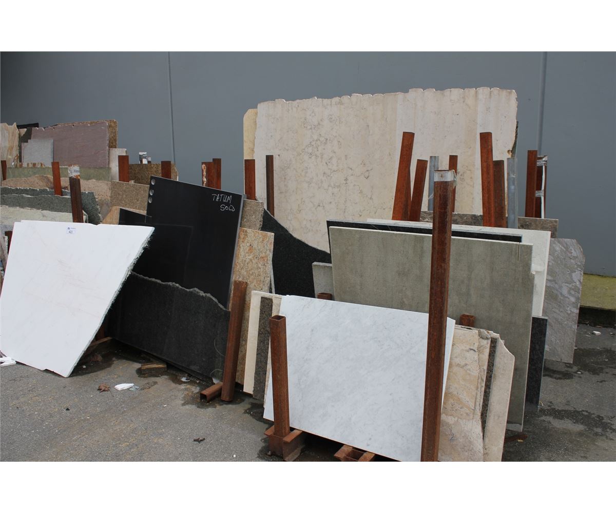 LARGE METAL GRANITE RACK W/ASSORTED GRANITE SLABS