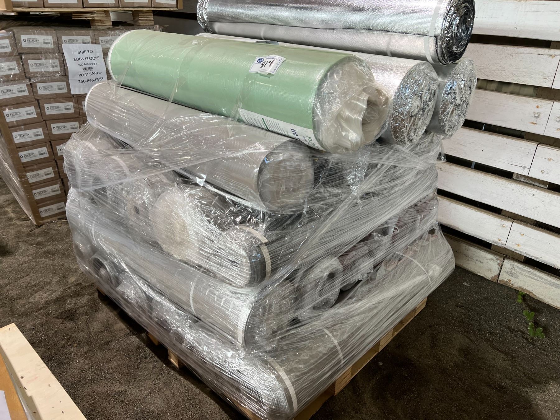 LARGE MIXED LOT RED UNDERLAYMENT, NOISE GUARD, FOAM, PADS ETC APPROX 25 ROLLS