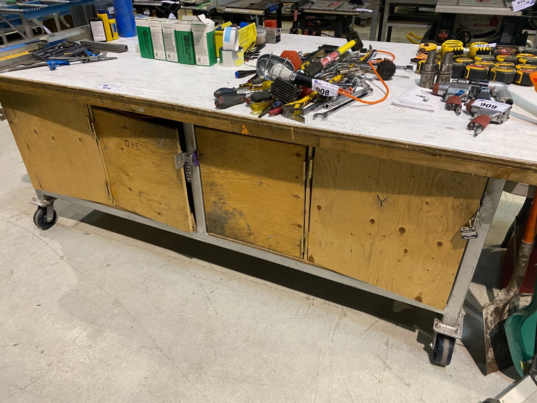 LARGE MOBILE WORK BENCH WITH LOCKING STORAGE, 4' X 8'