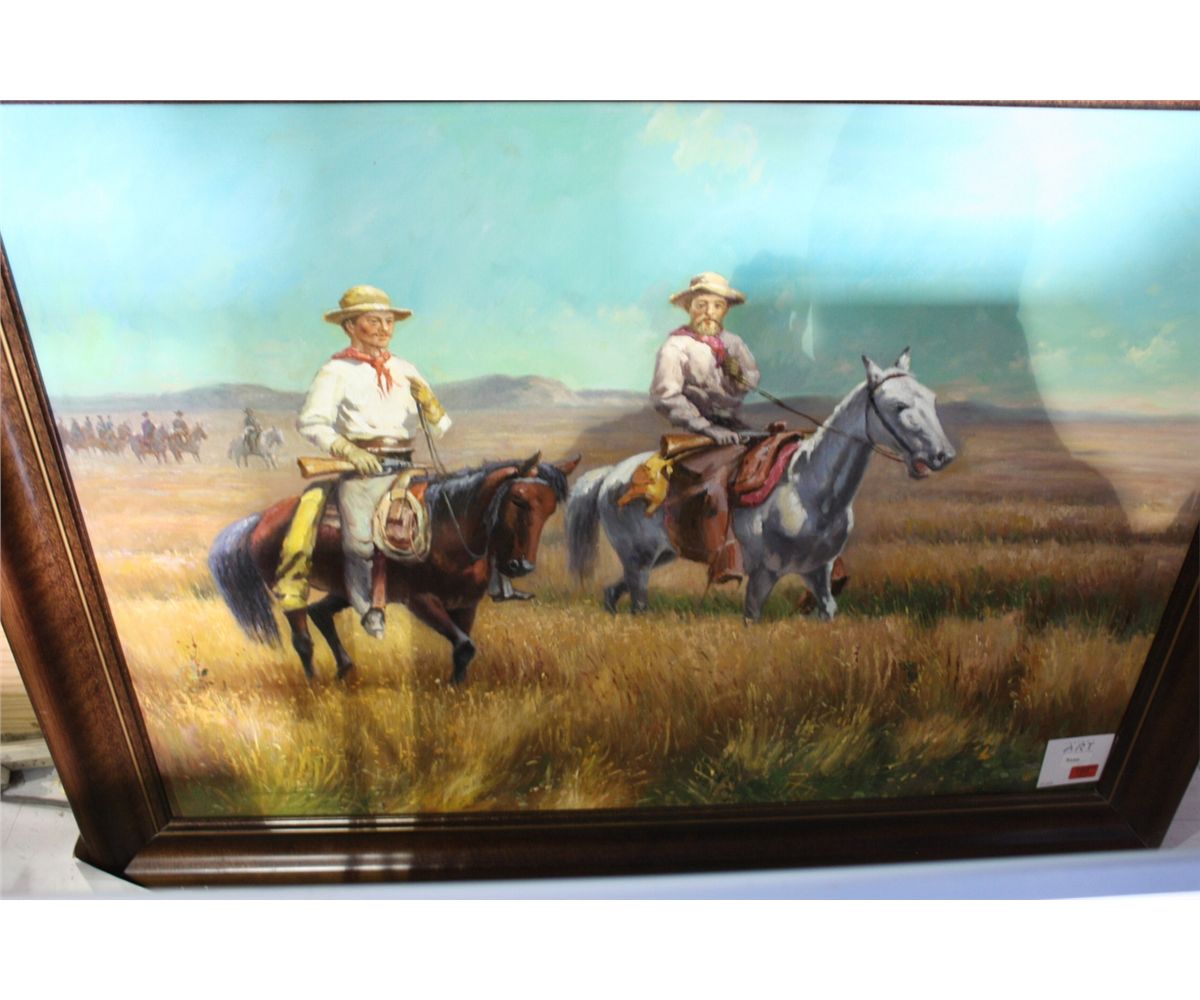 LARGE OIL PAINTING OF COWBOYS ON HORSES