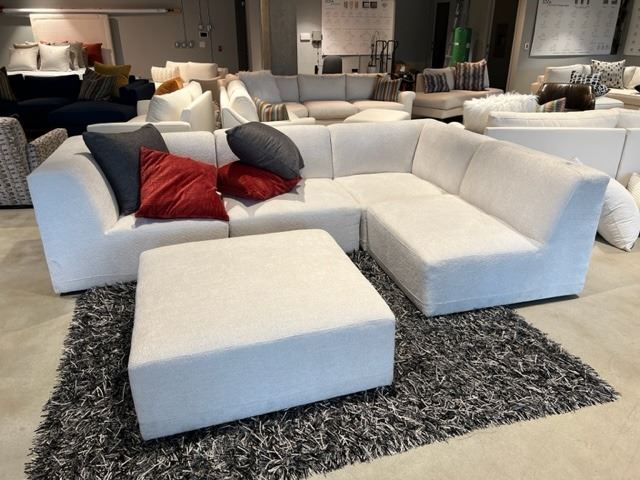 LARGE OVERSTUFFED L-SHAPED SECTIONAL SOFA WITH OTTOMAN AND THROW CUSHIONS, 120" X 78"