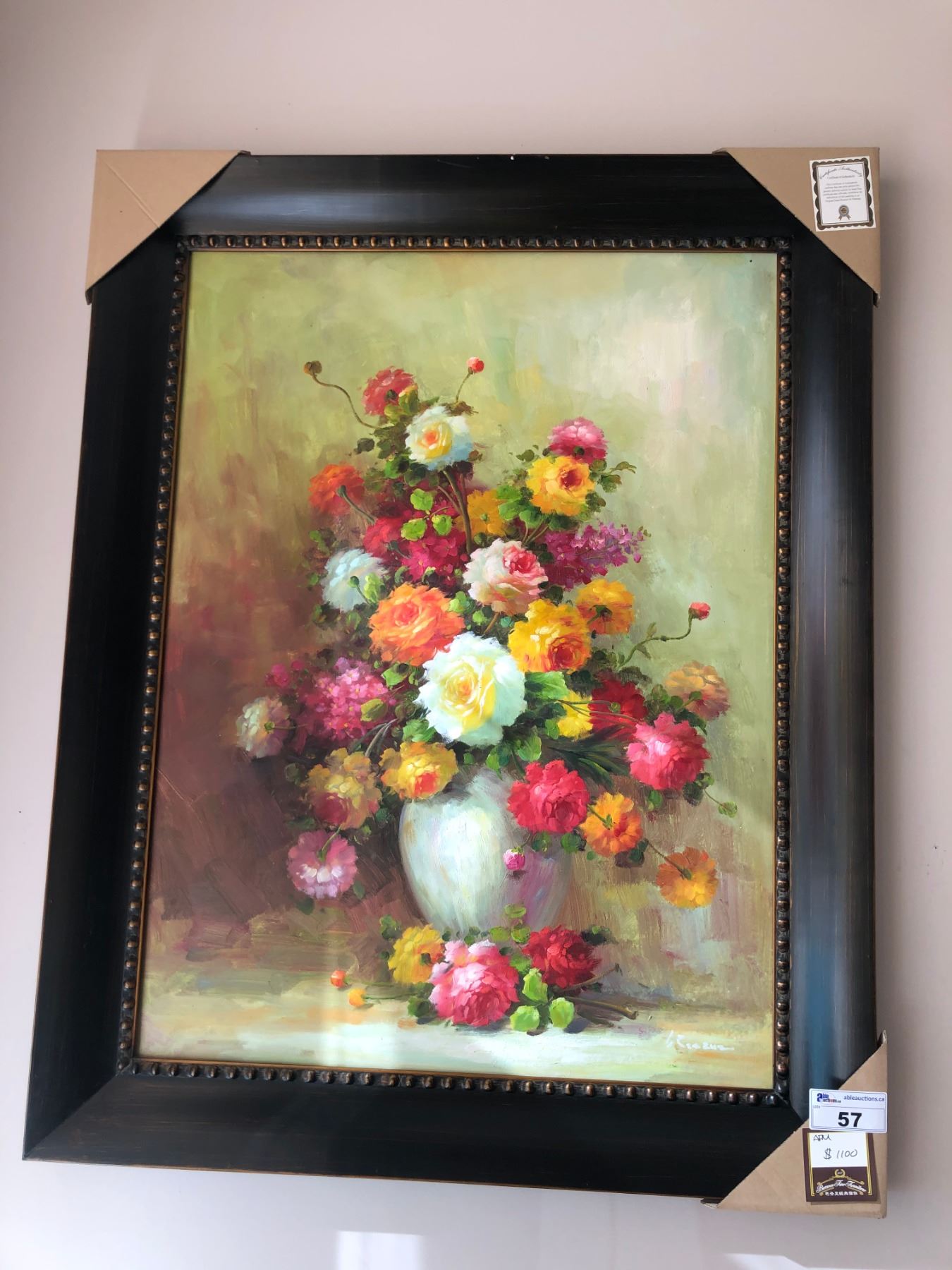 LARGE PAINTED FLORAL ARTWORK WITH WOODEN FRAME AND CERTIFICATE OF AUTHENTICITY. RETAIL $1,100.00