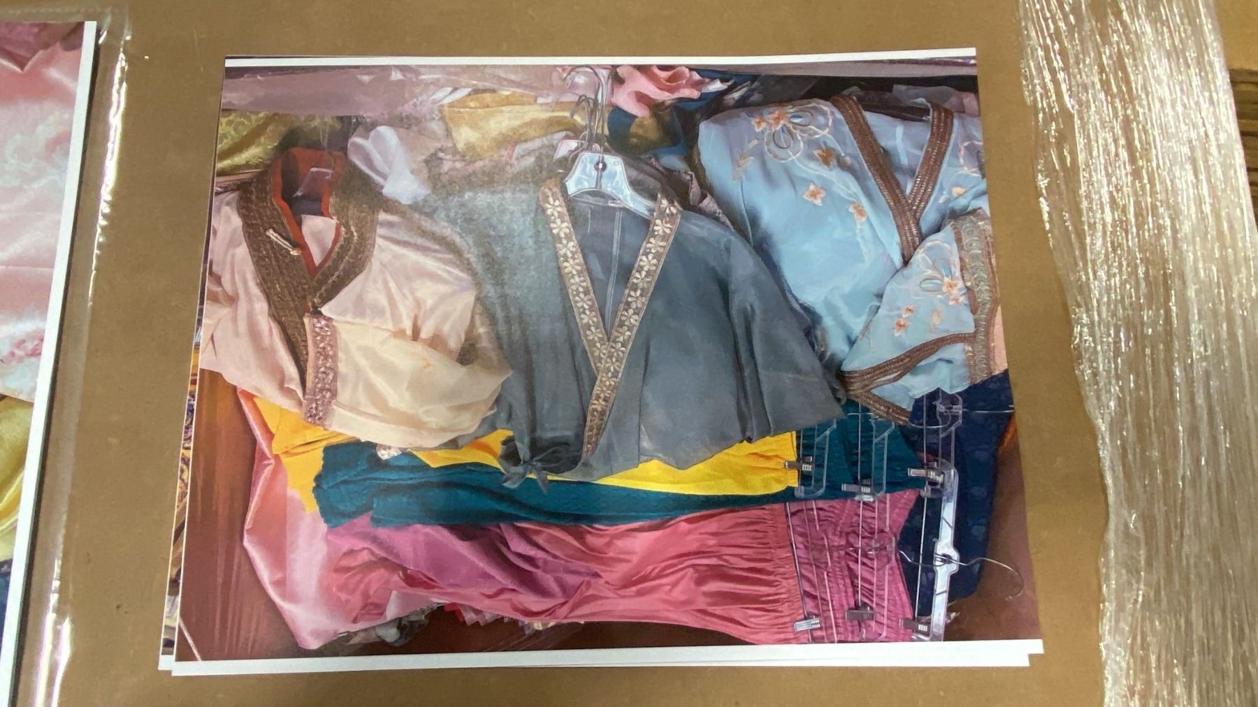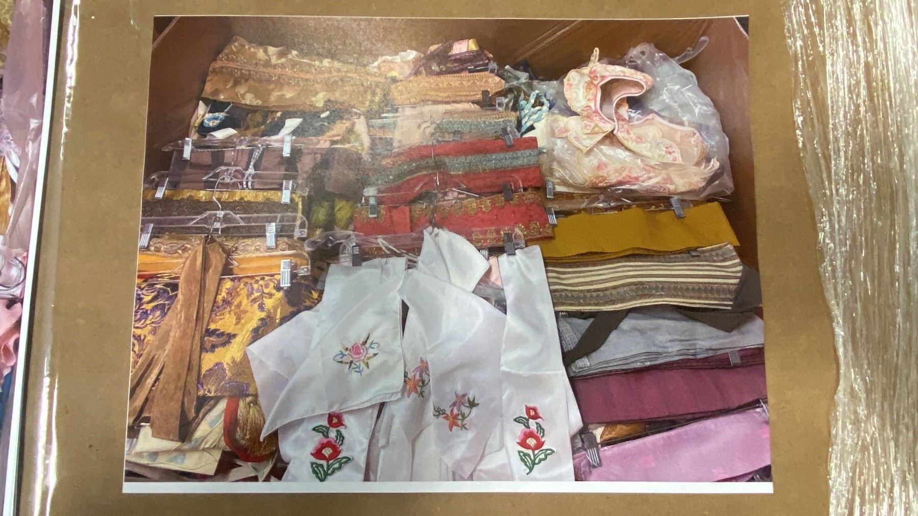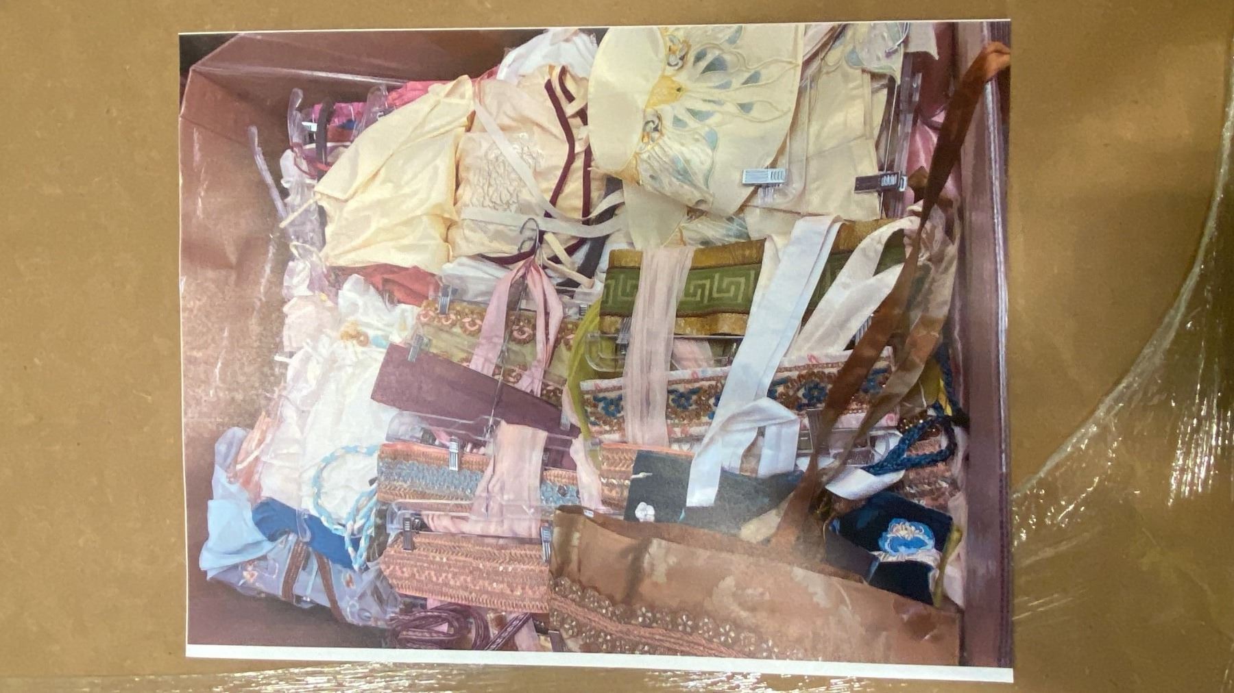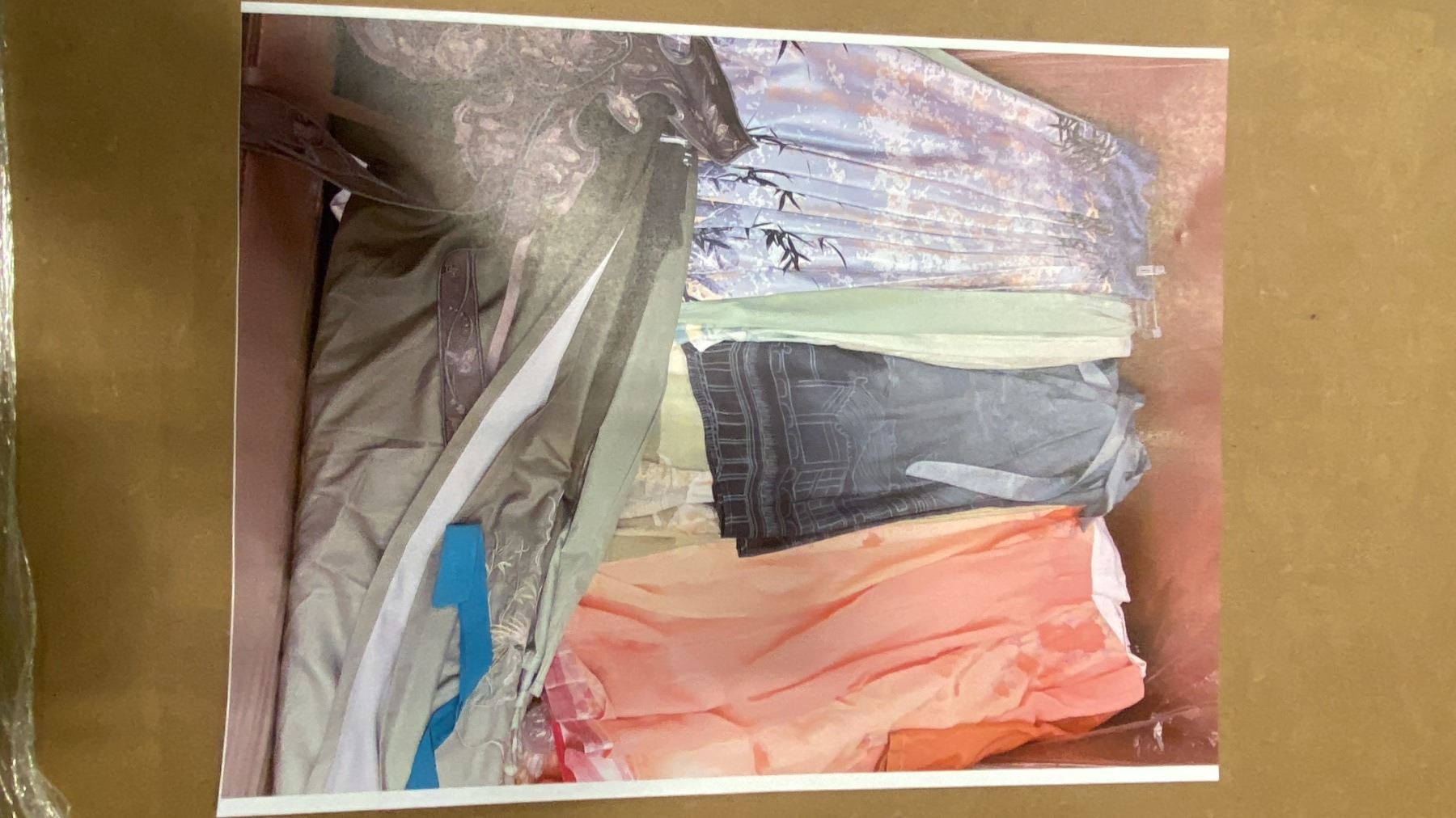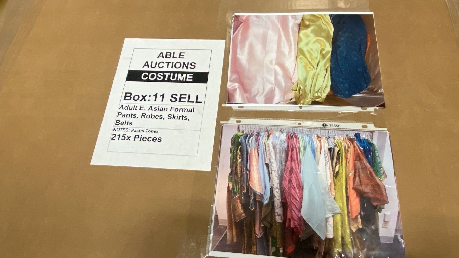 LARGE PALLET BOX OF ASSORTED WARDROBE - PANTS, ROBES, SHIRTS, BELTS *E.ASIAN FORMAL WEAR*