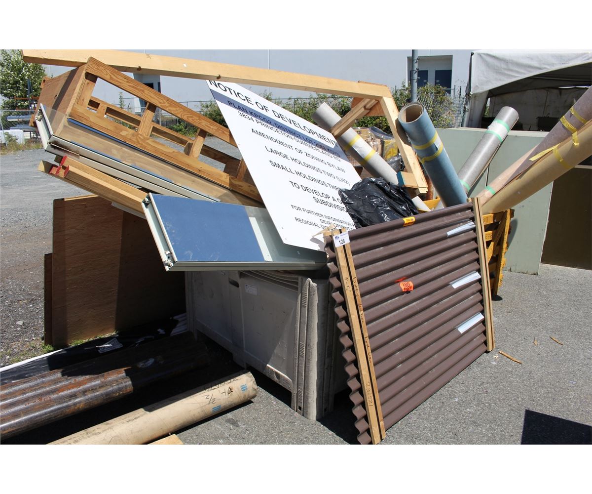 LARGE PALLET LOT FULL OF ASSORTED BUILDING ITEMS; METAL SHEETING, PLYWOOD, 2X4S ETC