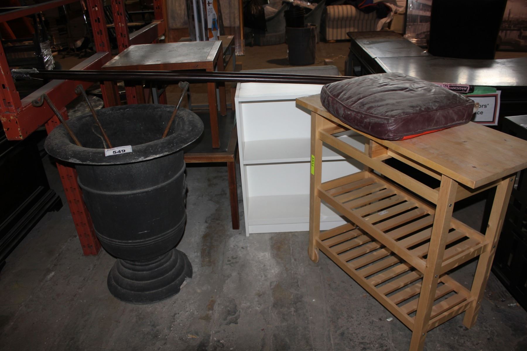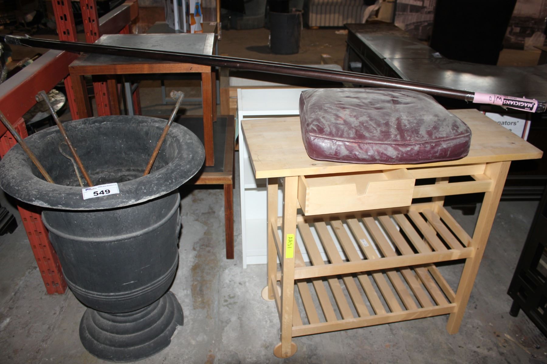 LARGE PLANTER, WOODEN BUTCHER BLOCK TABLE AND 2 END TABLES
