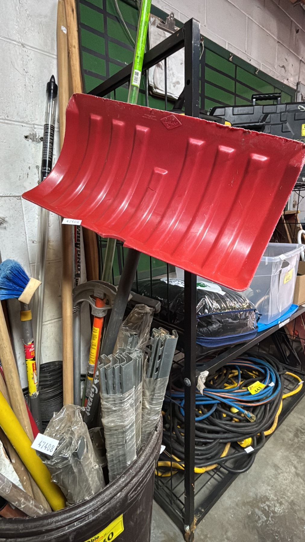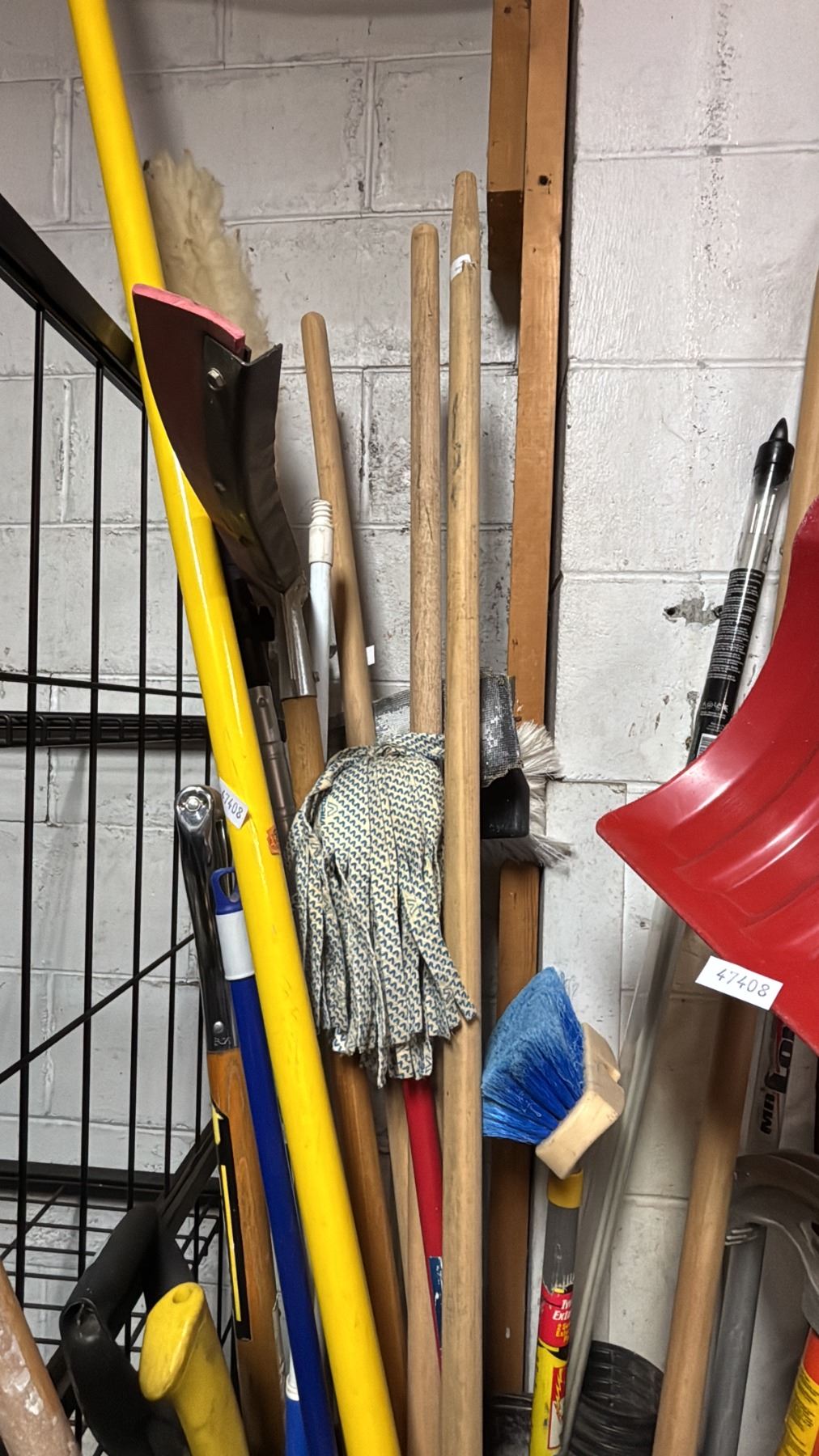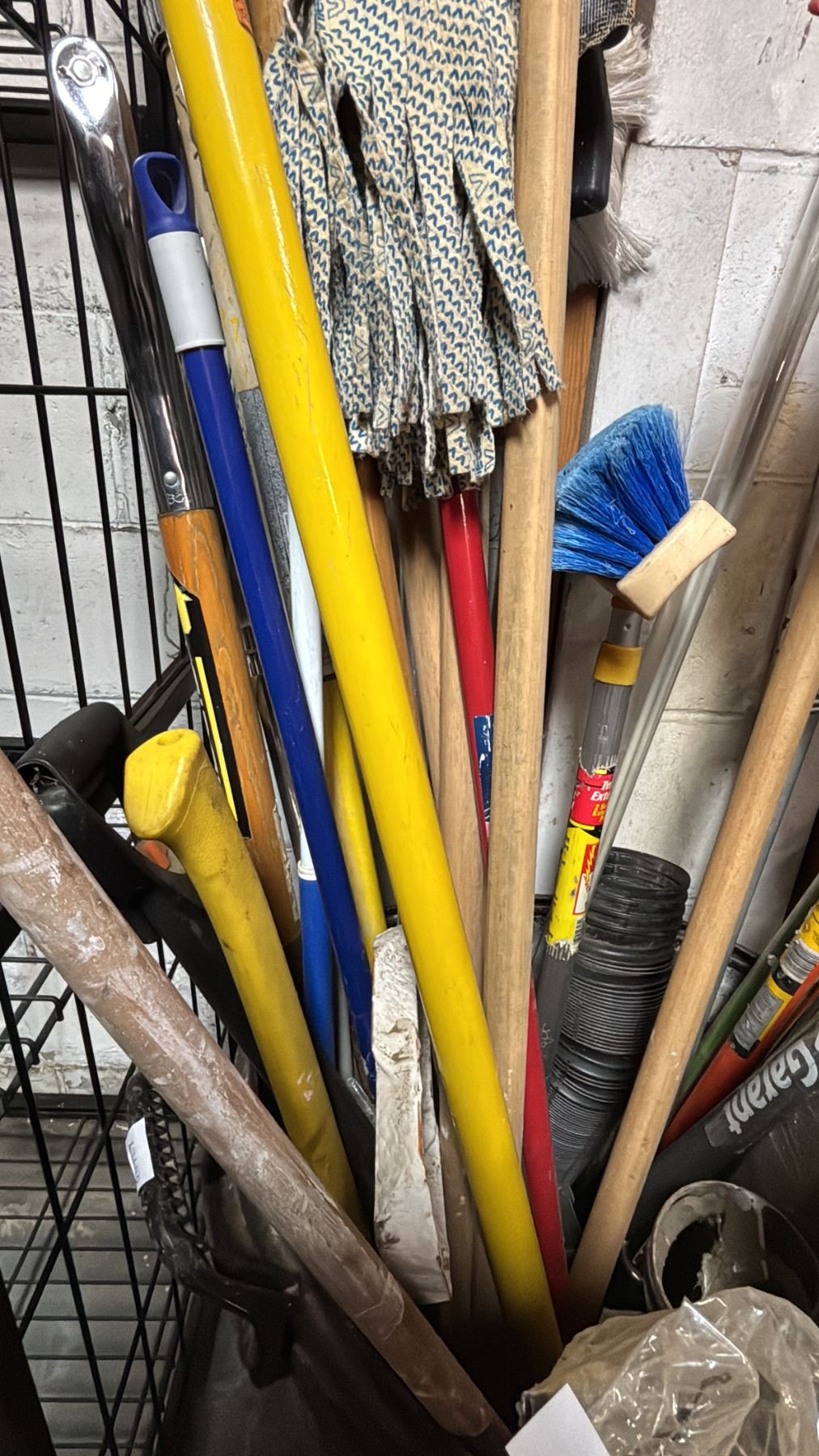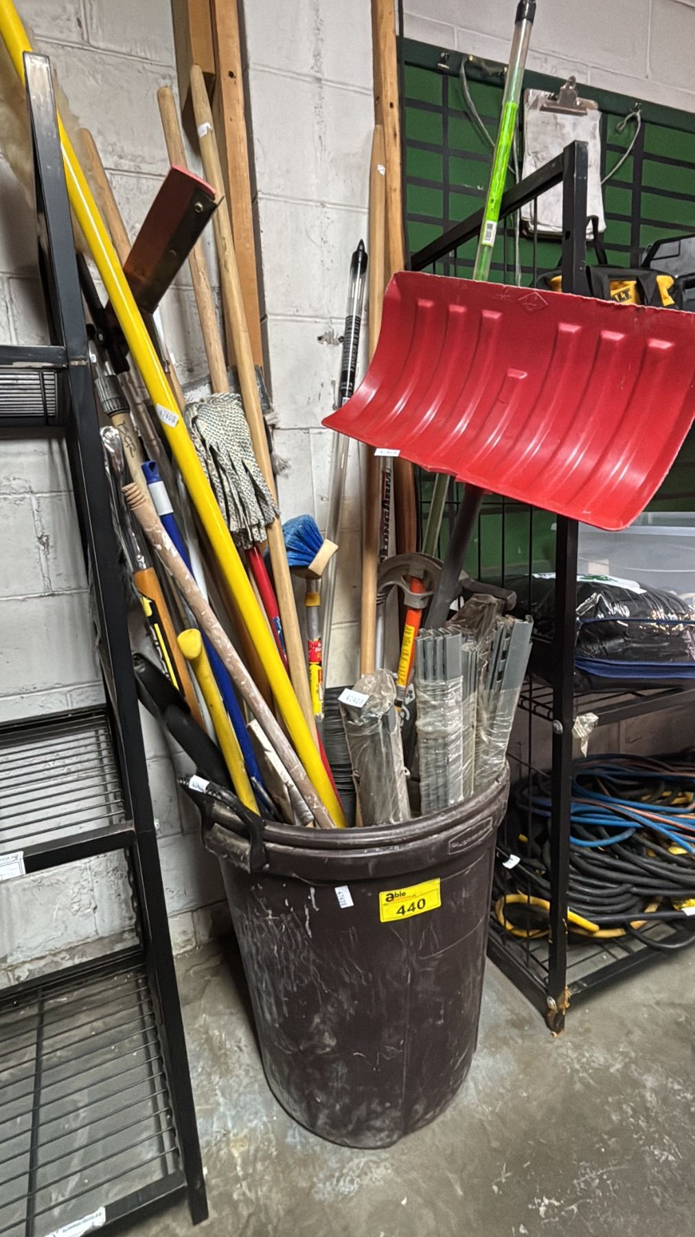 LARGE PLASTIC GARBAGE BIN OF MOPS, BROOMS, DUSTERS, SNOW SHOVEL & MORE