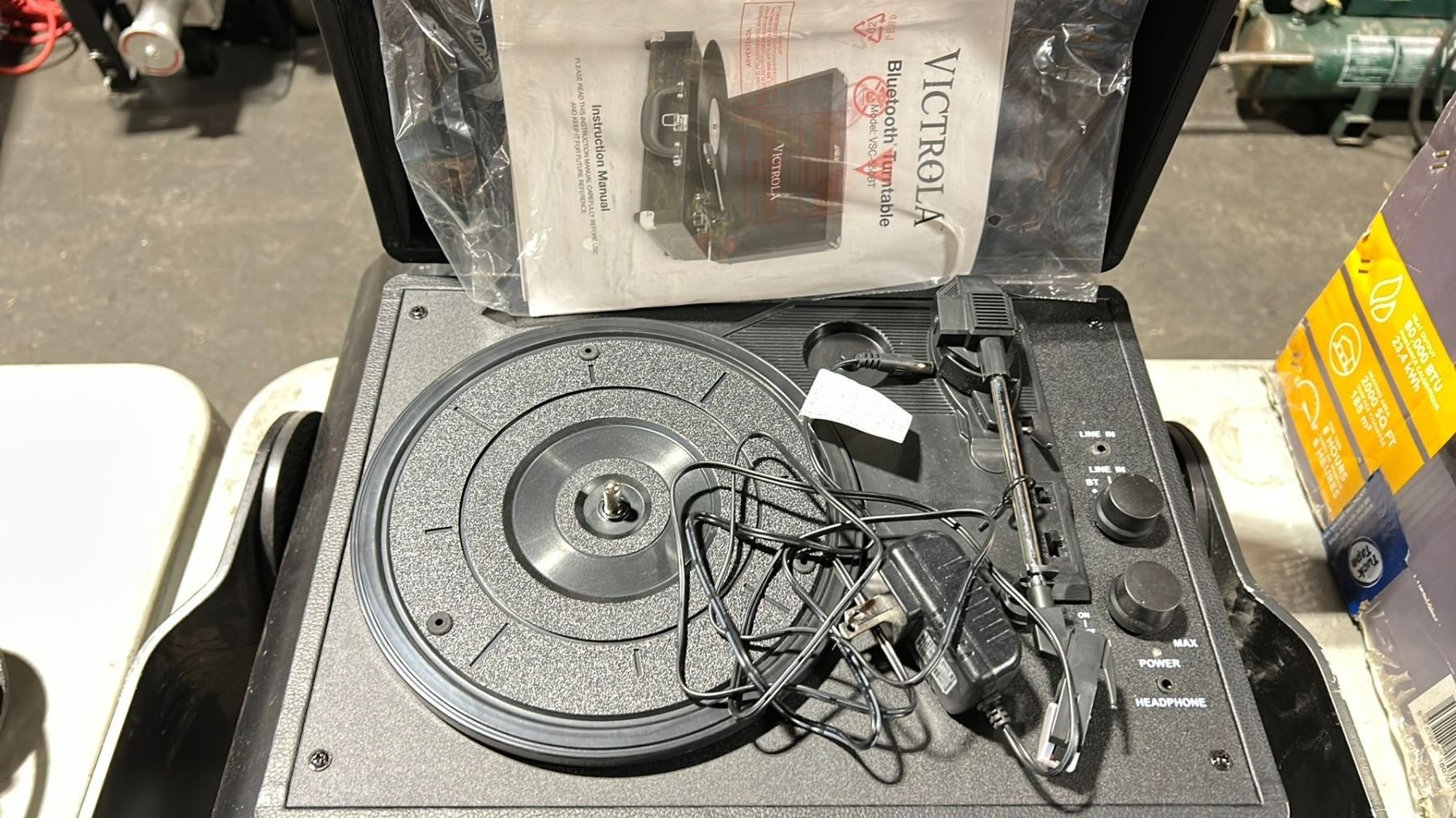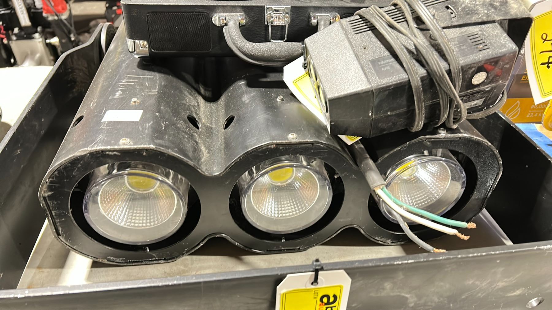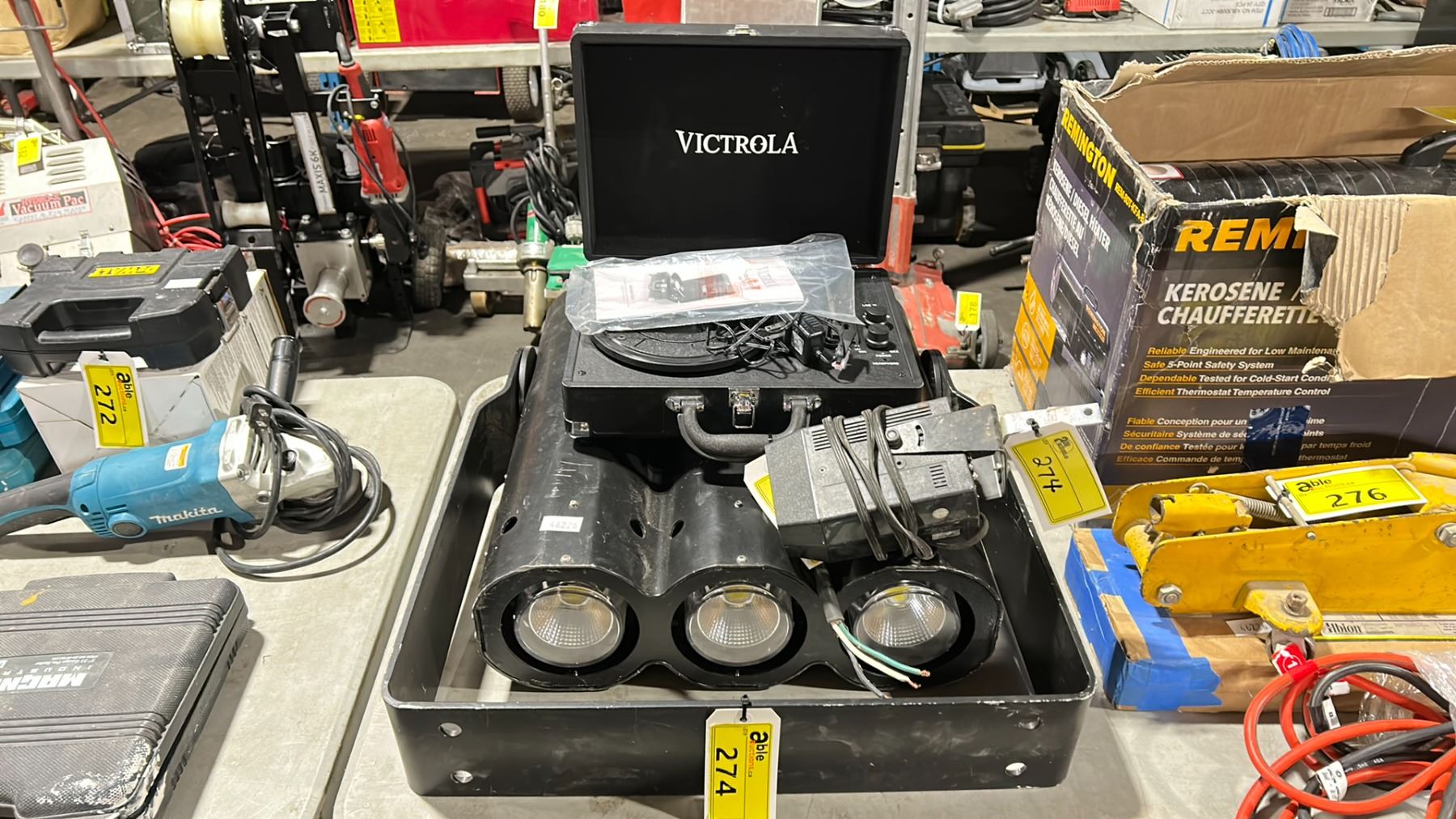 LARGE PROFESSIONAL STAGE 3 SPOT LIGHT, MINI SAFEHOUSE SENSOR, & VICTROLA BLUETOOTH TURN TABLE