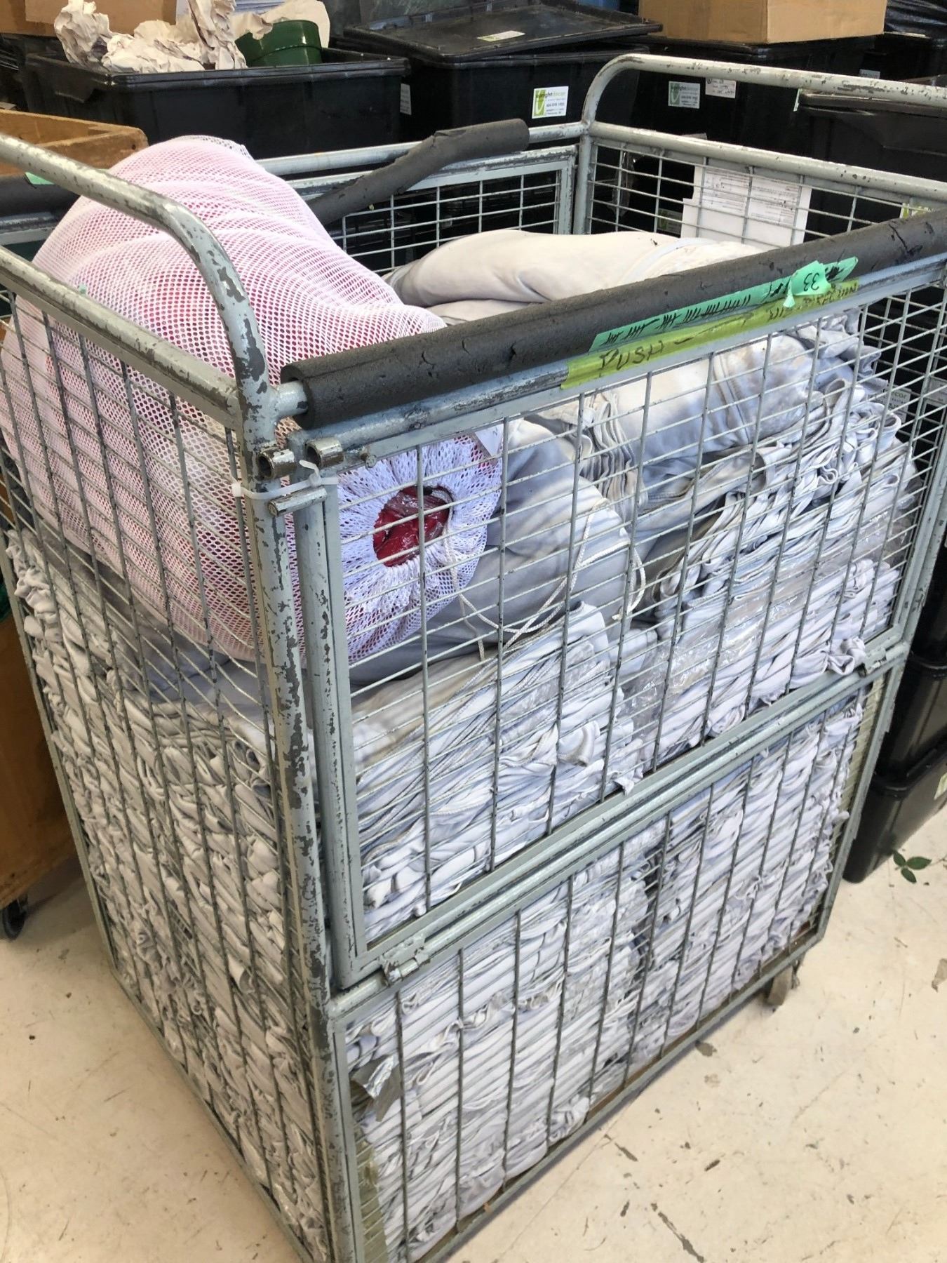 LARGE QUANTITY OF ASSORTED LINEN/MATERIAL, SHAPES AND SIZES MAY VARY, CART NOT INCLUDED, GREY AND OTHER
