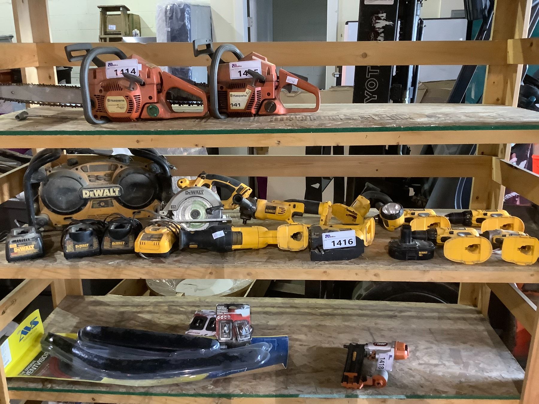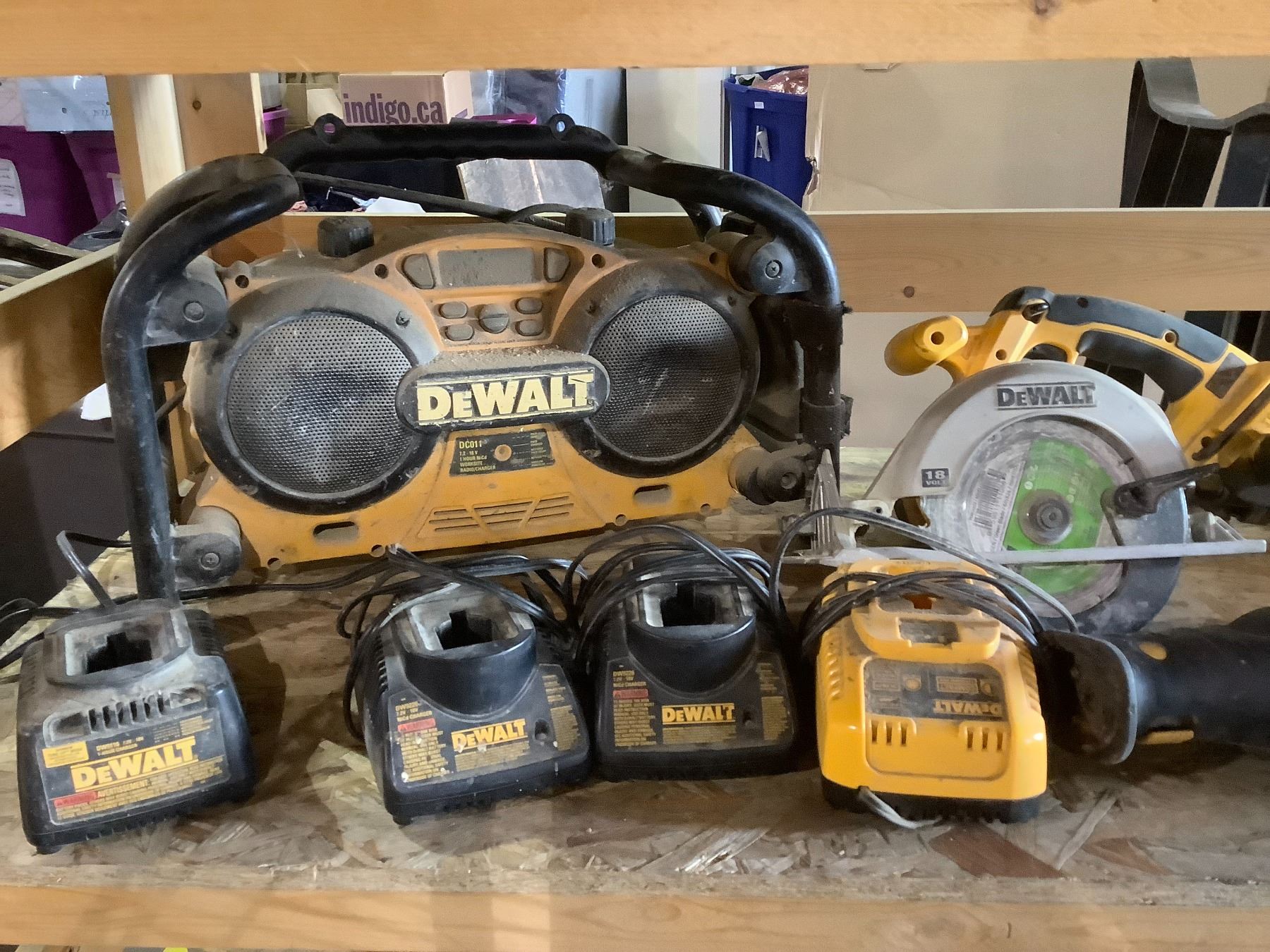 LARGE QUANTITY OF DEWALT ITEMS INCLUDING: 1 BATTERY, CORDLESS TOOLS (SAWZALL, DRILLS, LIGHT, 4 BATTERY CHARGERS, & DC011 RADIO