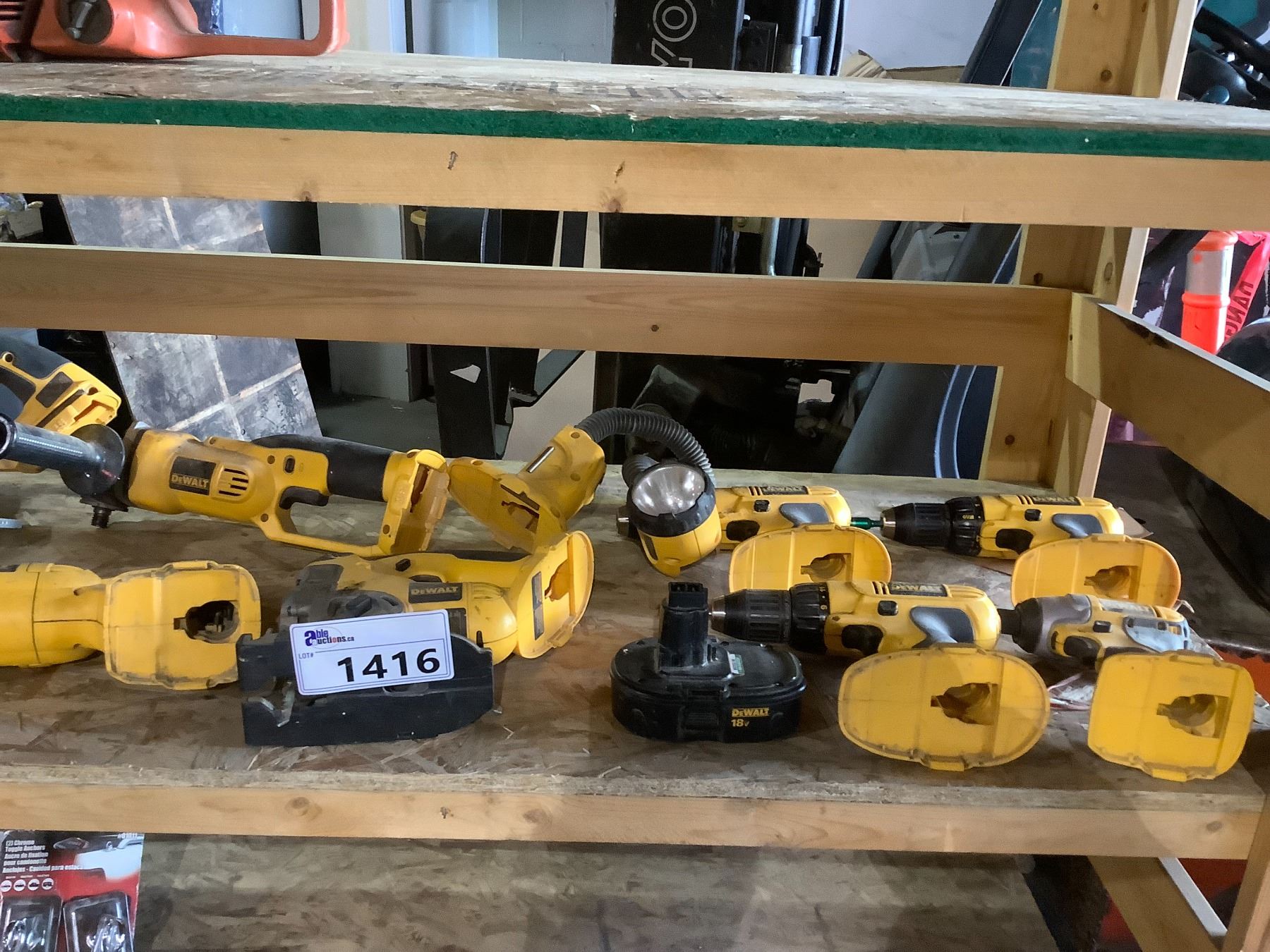 LARGE QUANTITY OF DEWALT ITEMS INCLUDING: 1 BATTERY, CORDLESS TOOLS (SAWZALL, DRILLS, LIGHT, 4