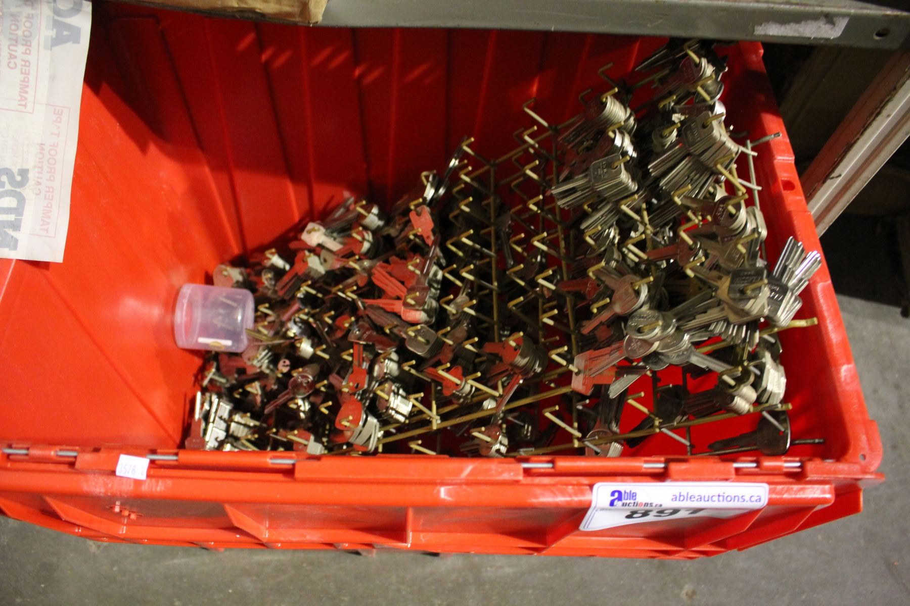 LARGE QUANTITY OF UNCUT KEYS WITH DISPLAY RACK IN TOTE