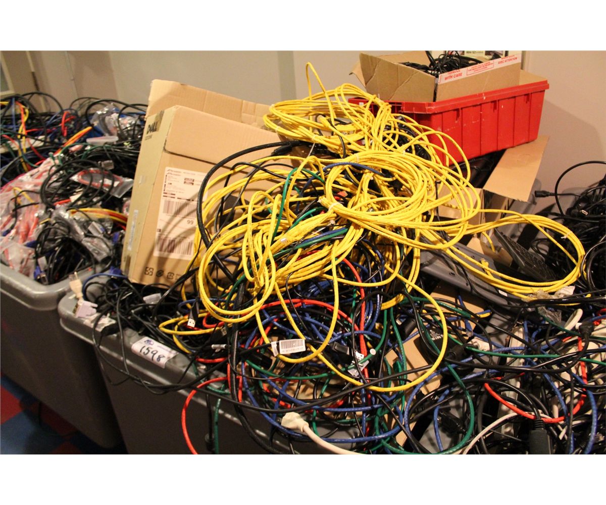 LARGE ROLLING BIN FULL OF COMPUTER AND AV CABLES, KEYBOARDS AND MORE..... BIN NOT INCLUDED.