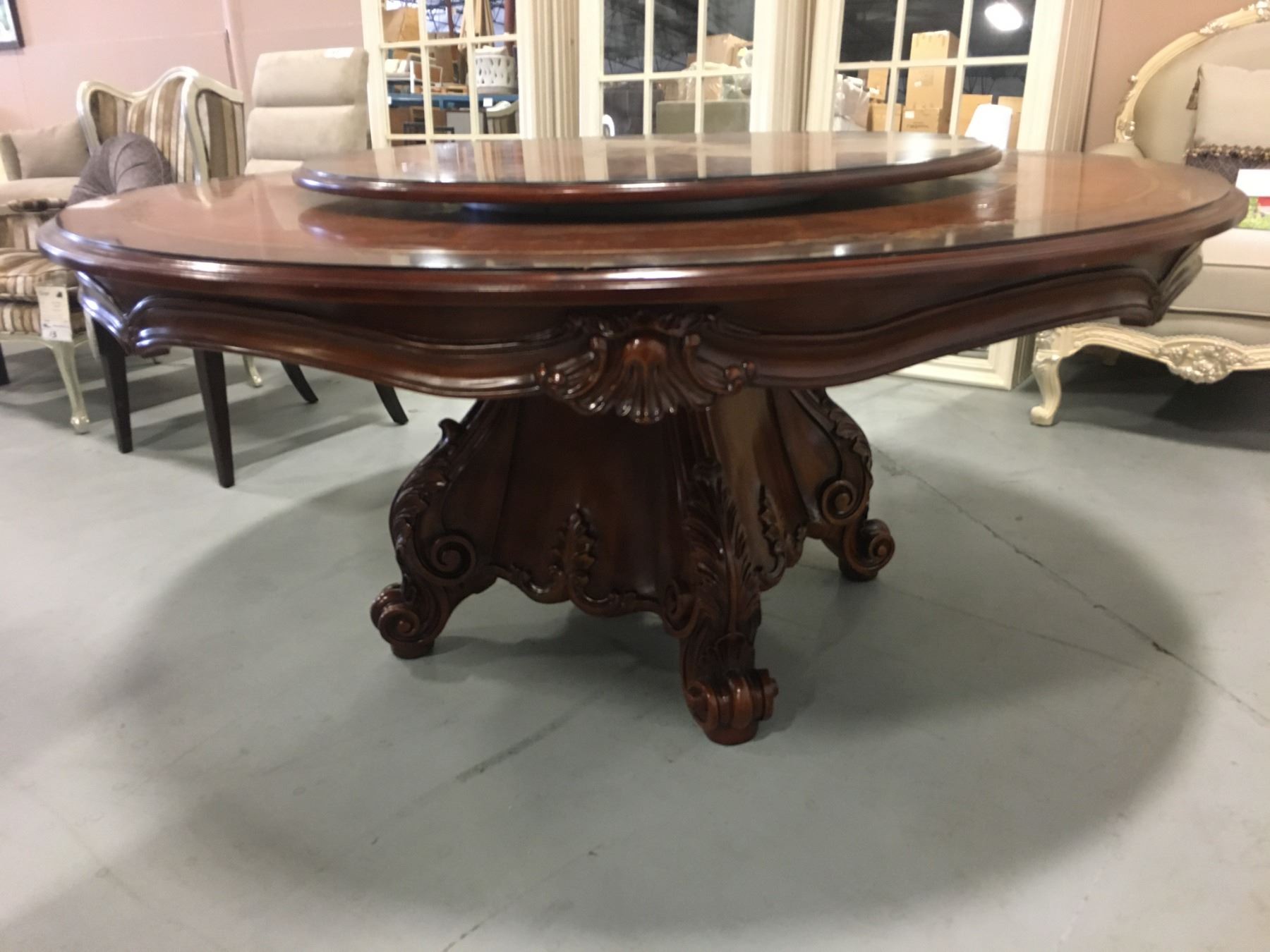 LARGE ROUND MAHOGANY FINISH HEAVILY CARVED DINING TABLE WITH LAZY SUSAN