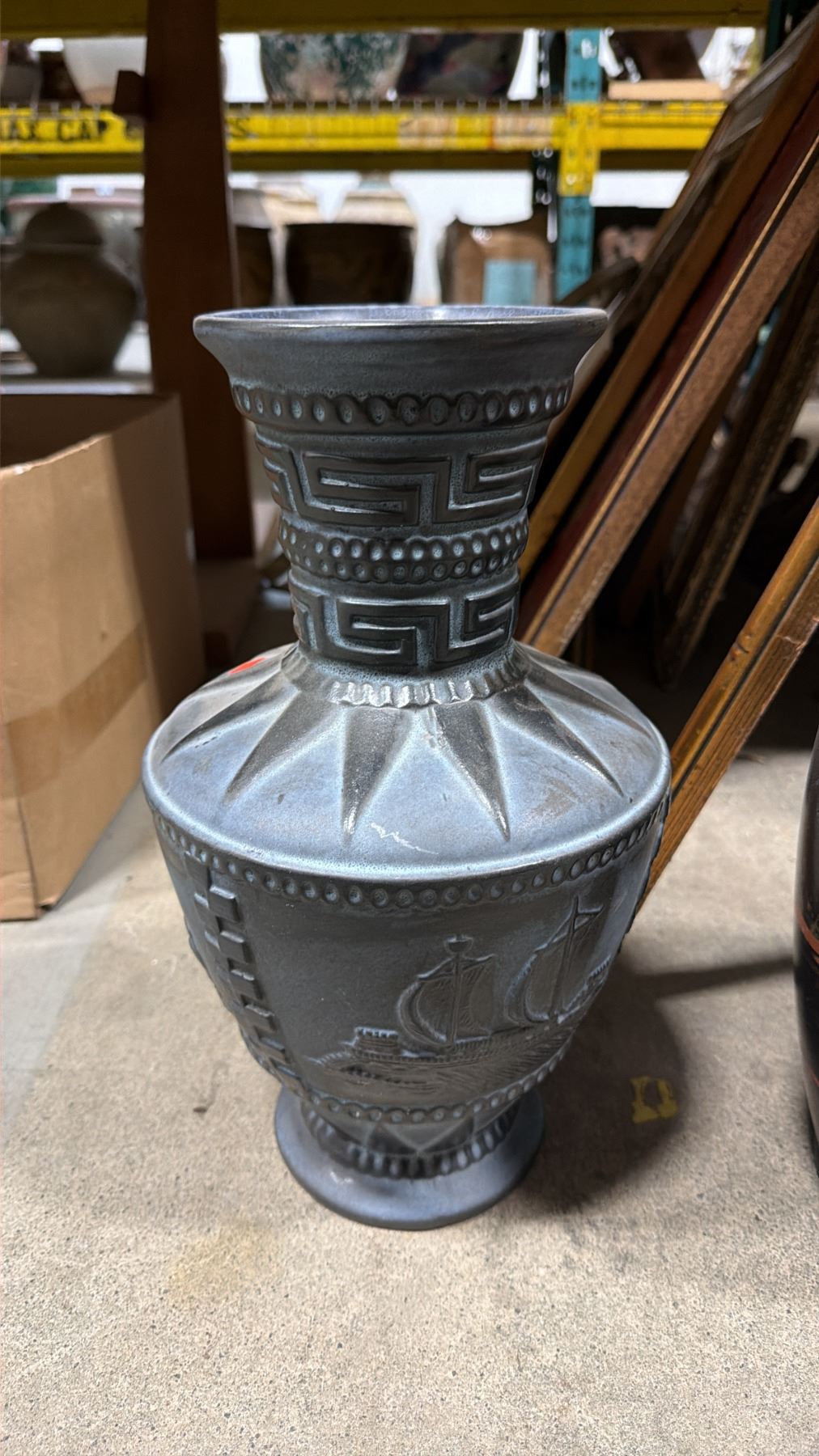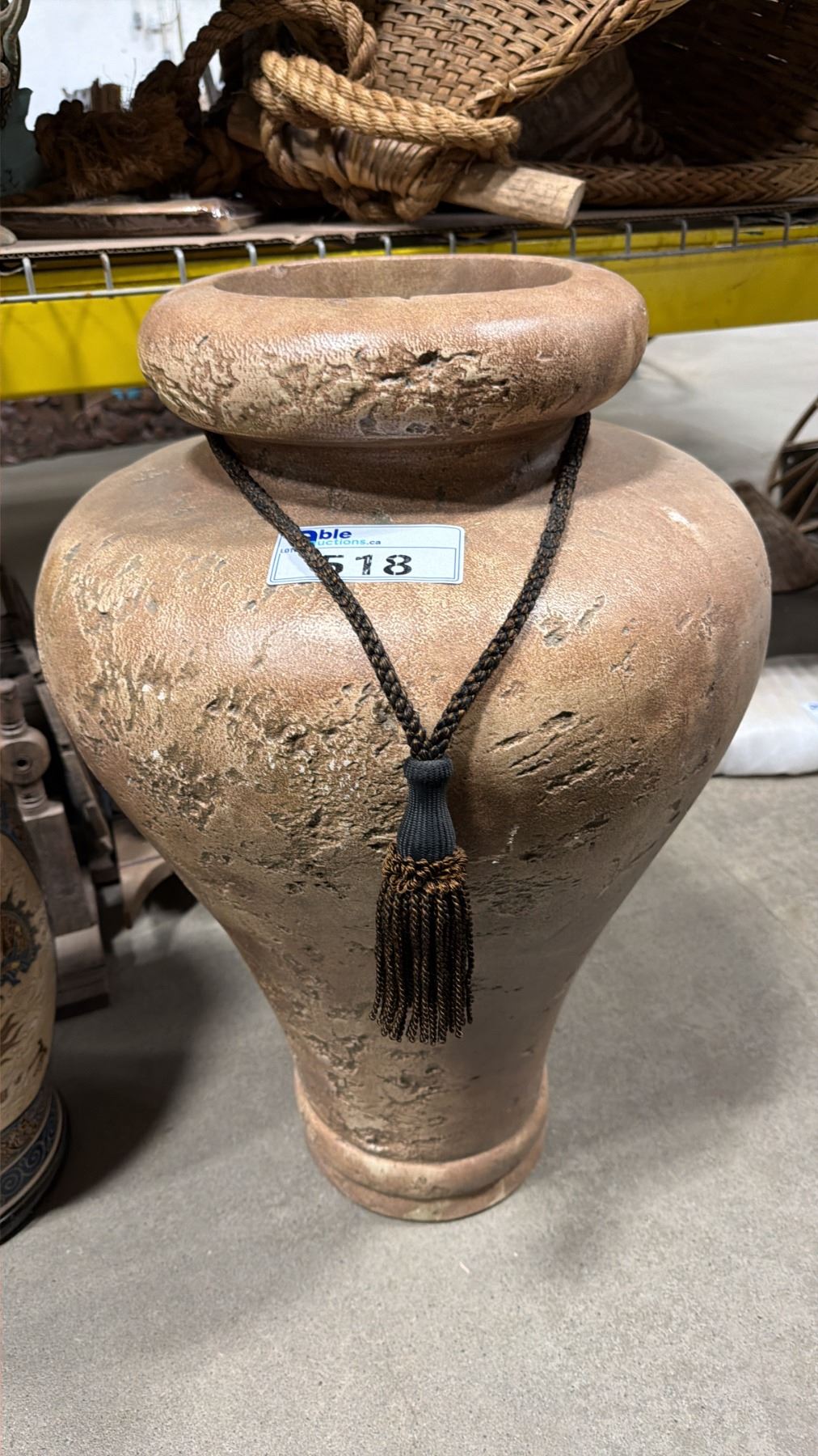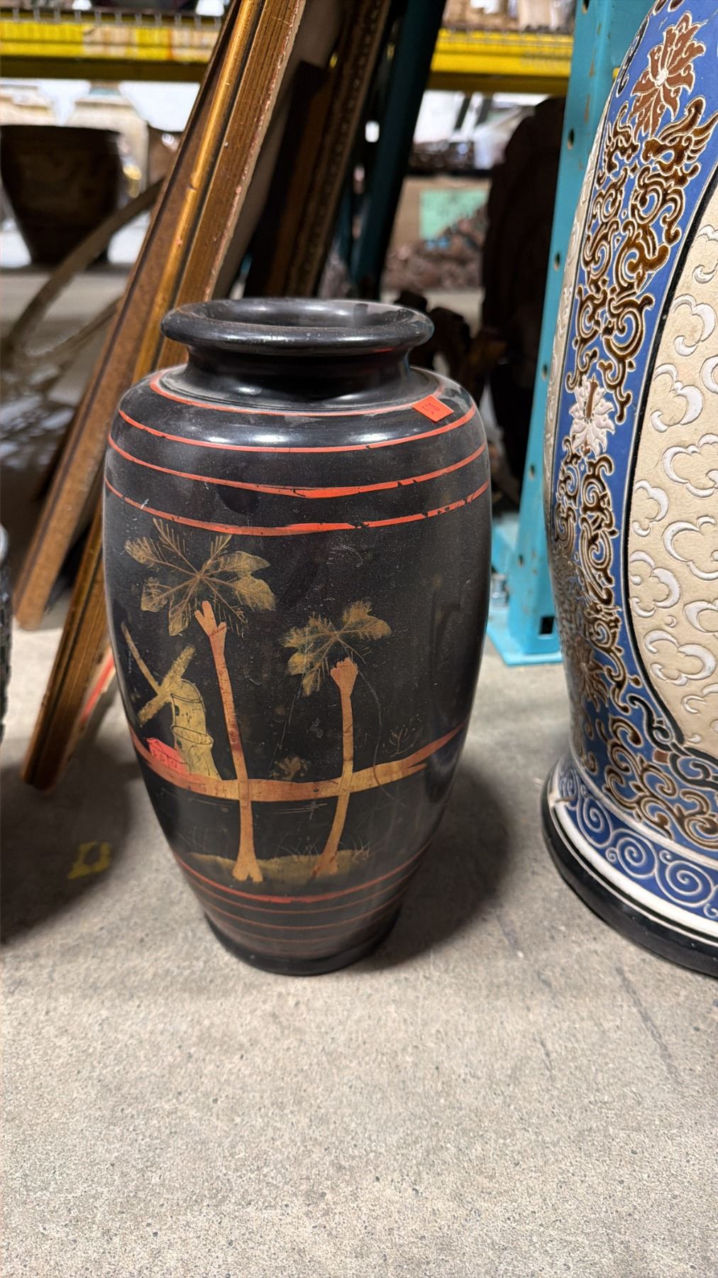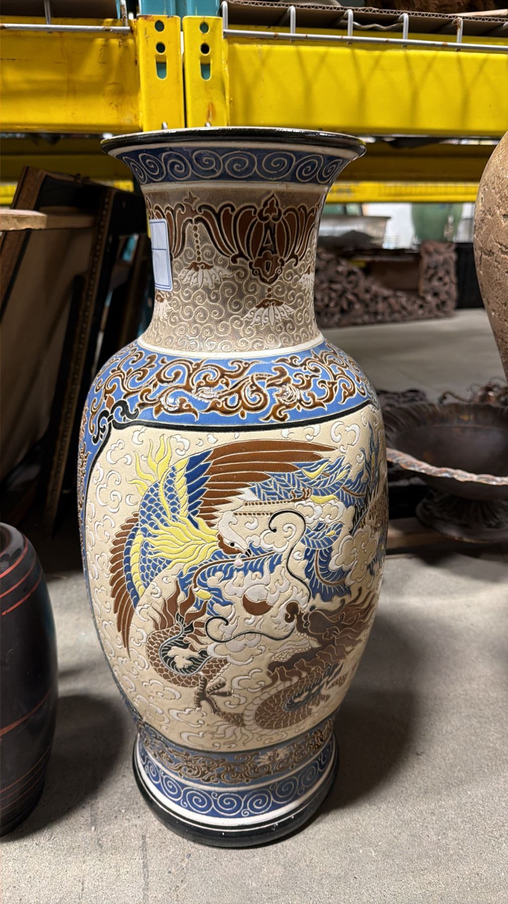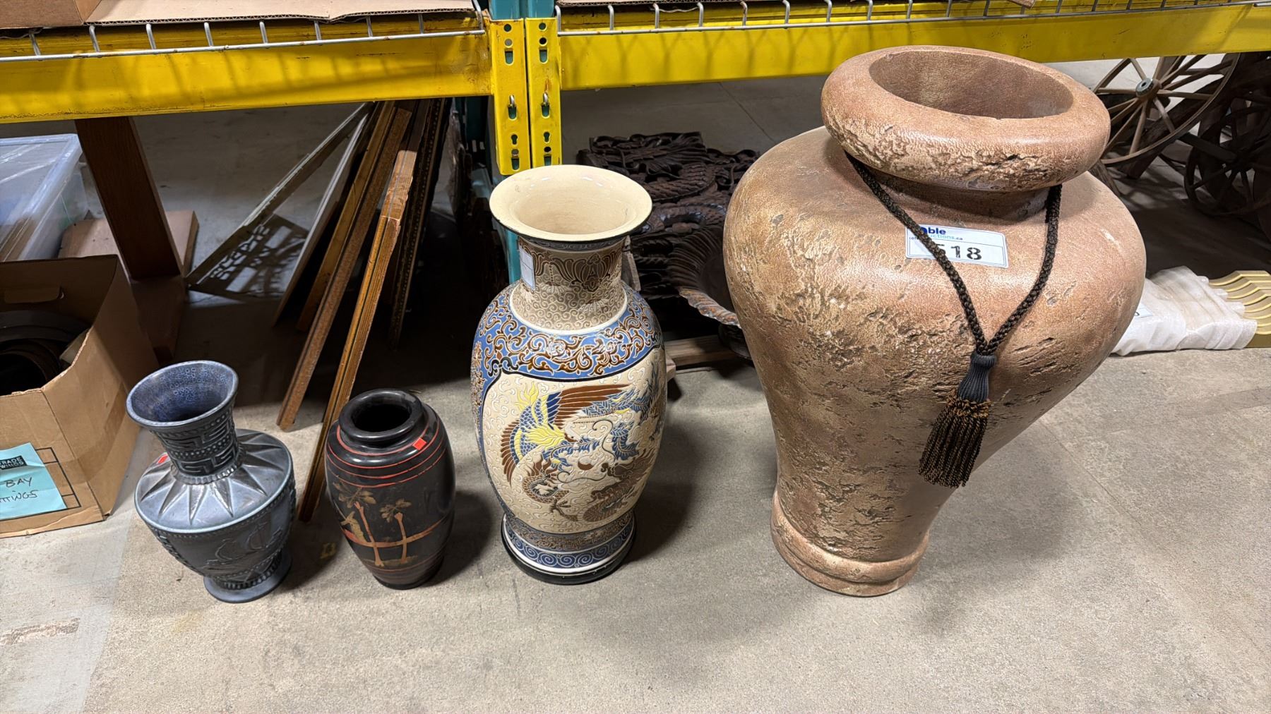LARGE RUSTIC FLOOR VASE, SMALL ASIAN DECORATIVE FLOOR VASE & 2 SMALL DECORATIVE FLOWER VASES