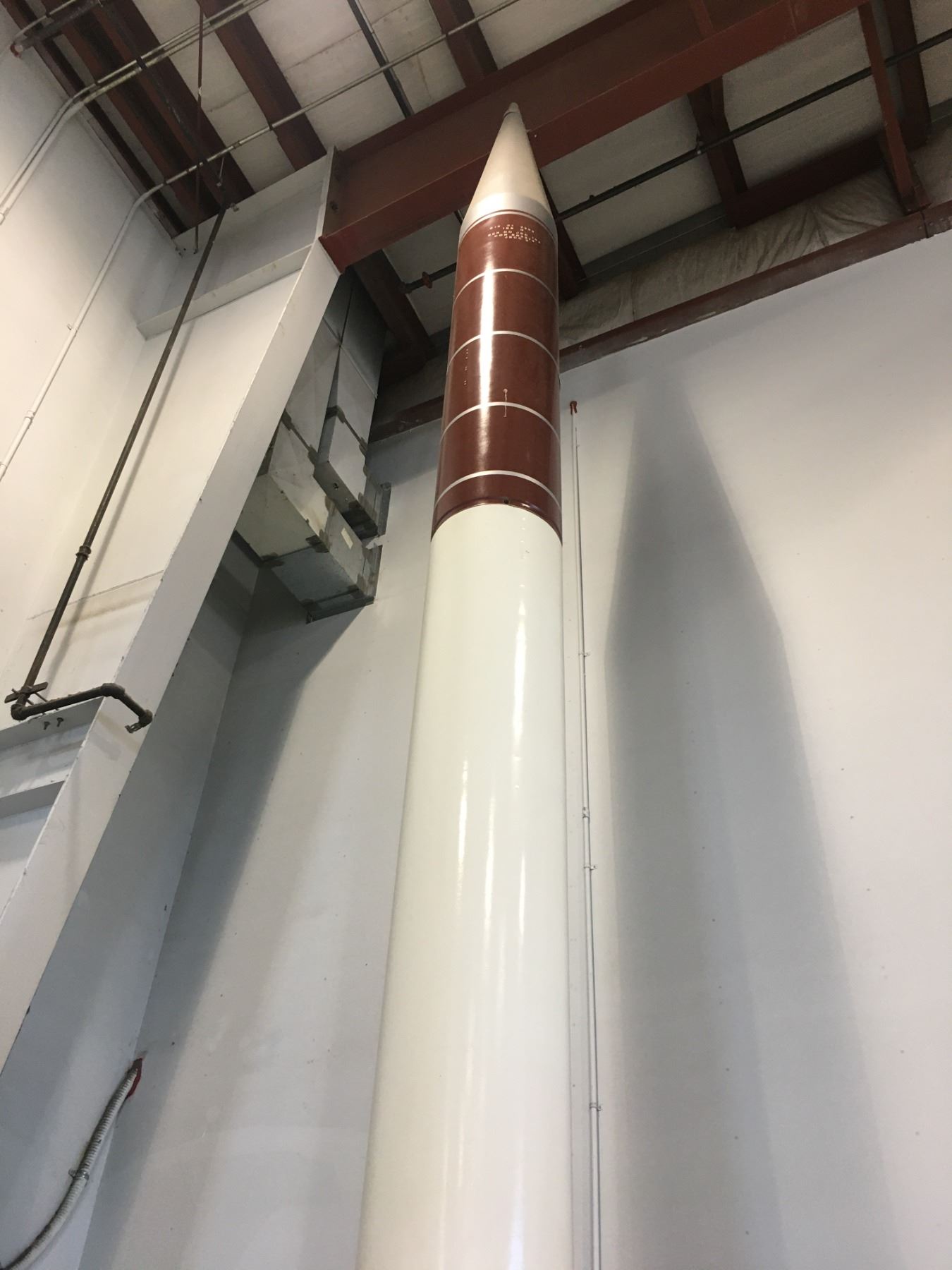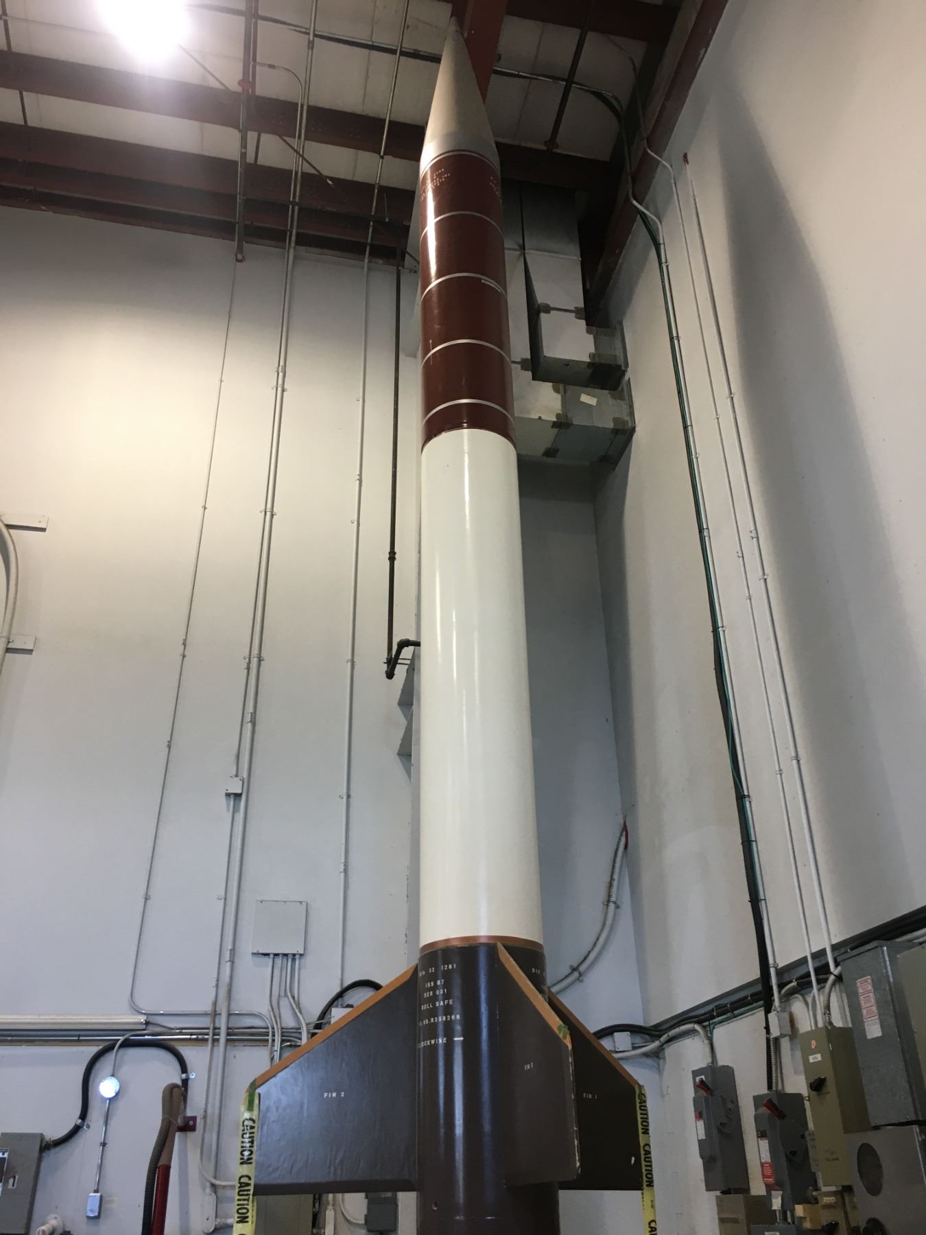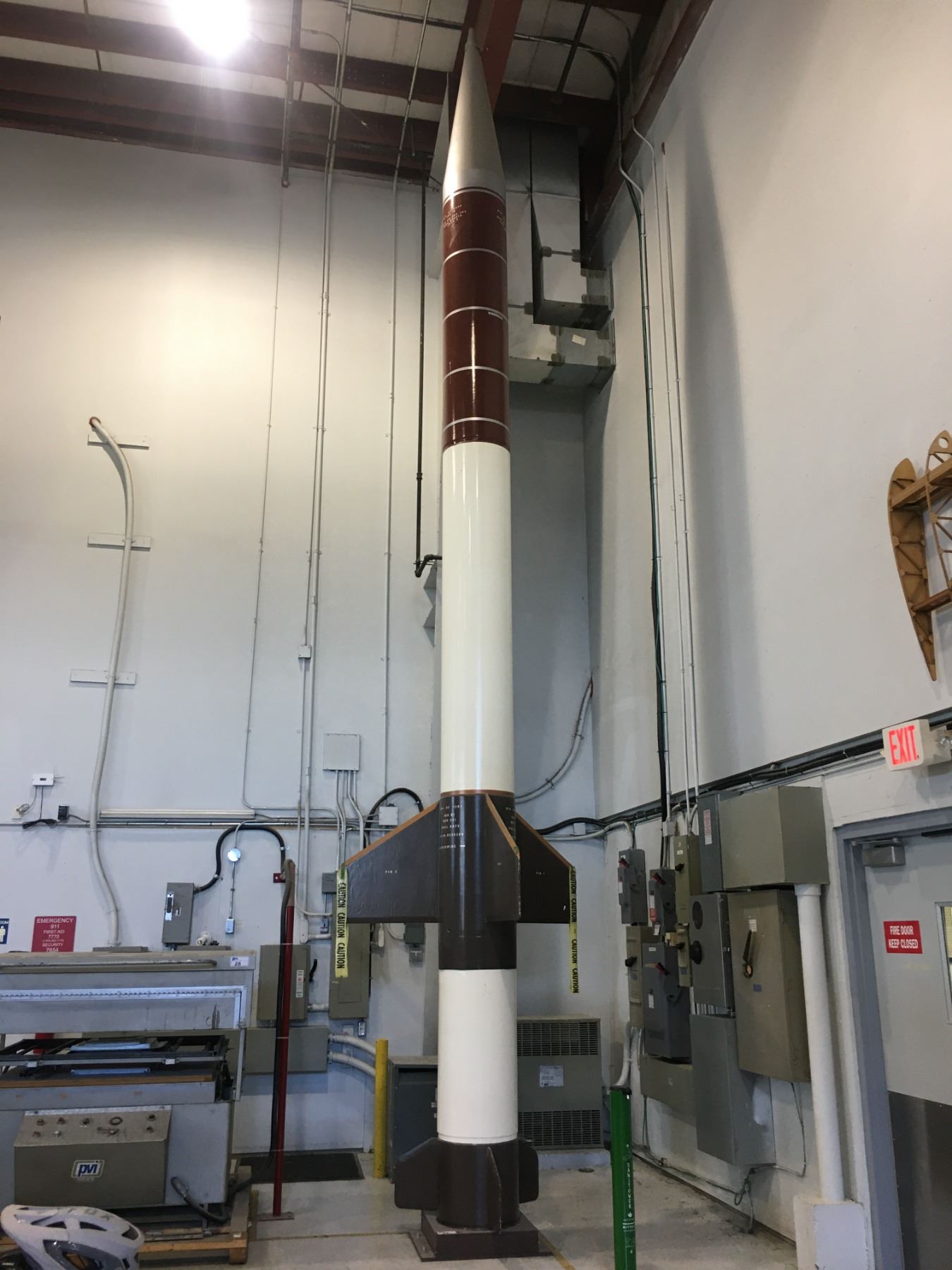 LARGE SCALE ROCKET-APPROX. 27' TALL W/ 18" DIAMETER, WOOD & CARDBOARD CONSTRUCTION COMES APART IN SECTIONS FOR TRANSPORT
