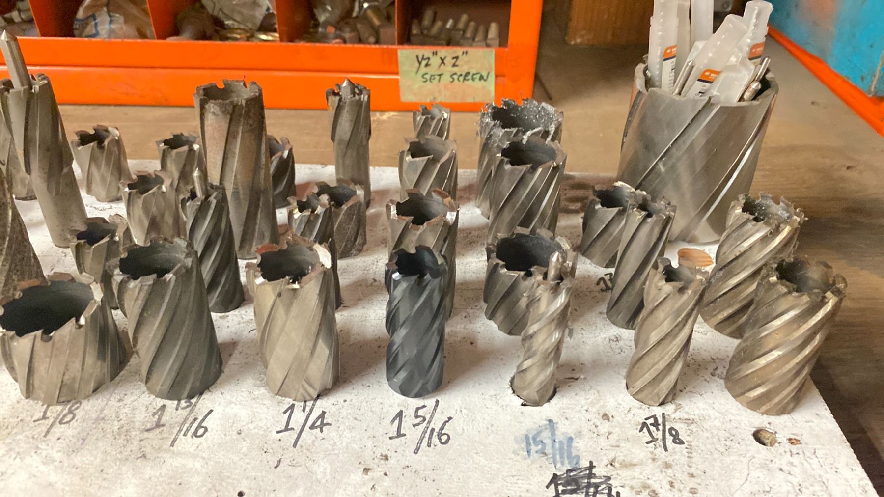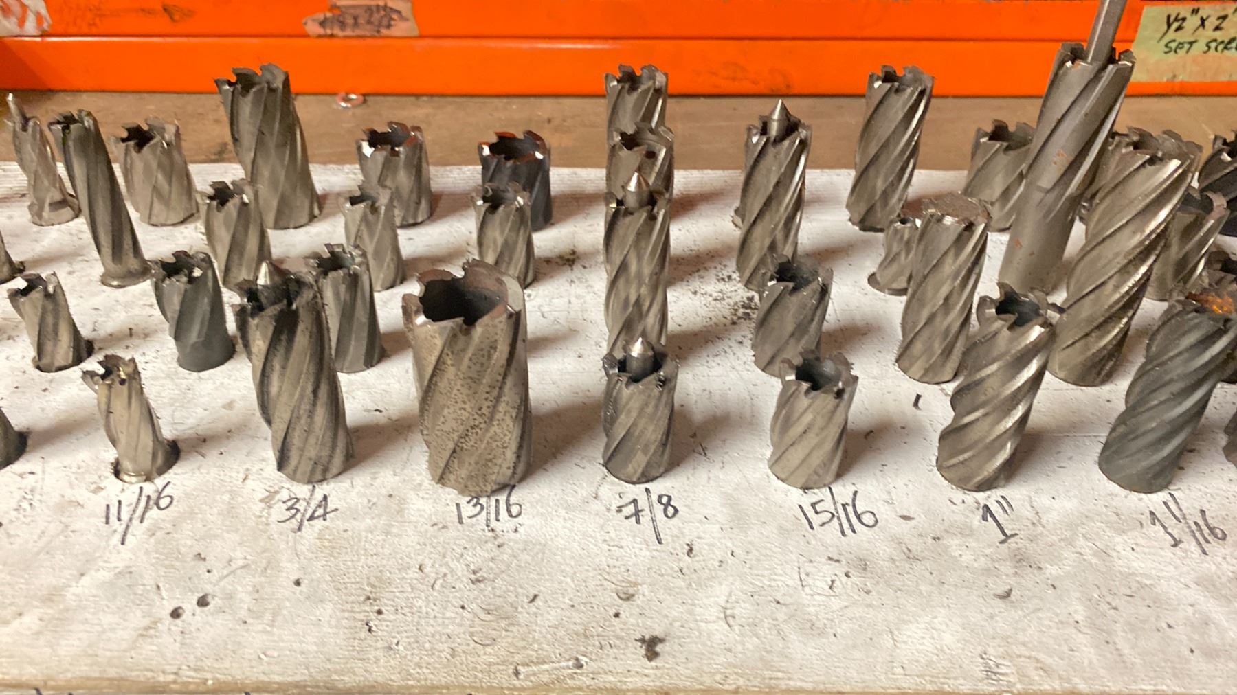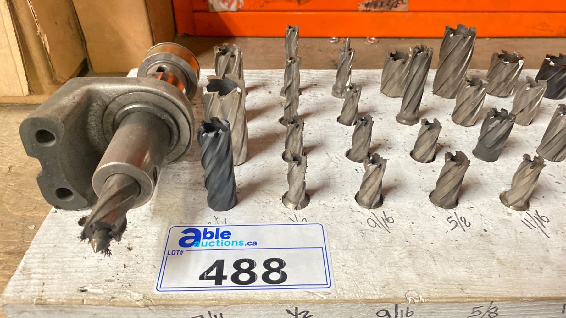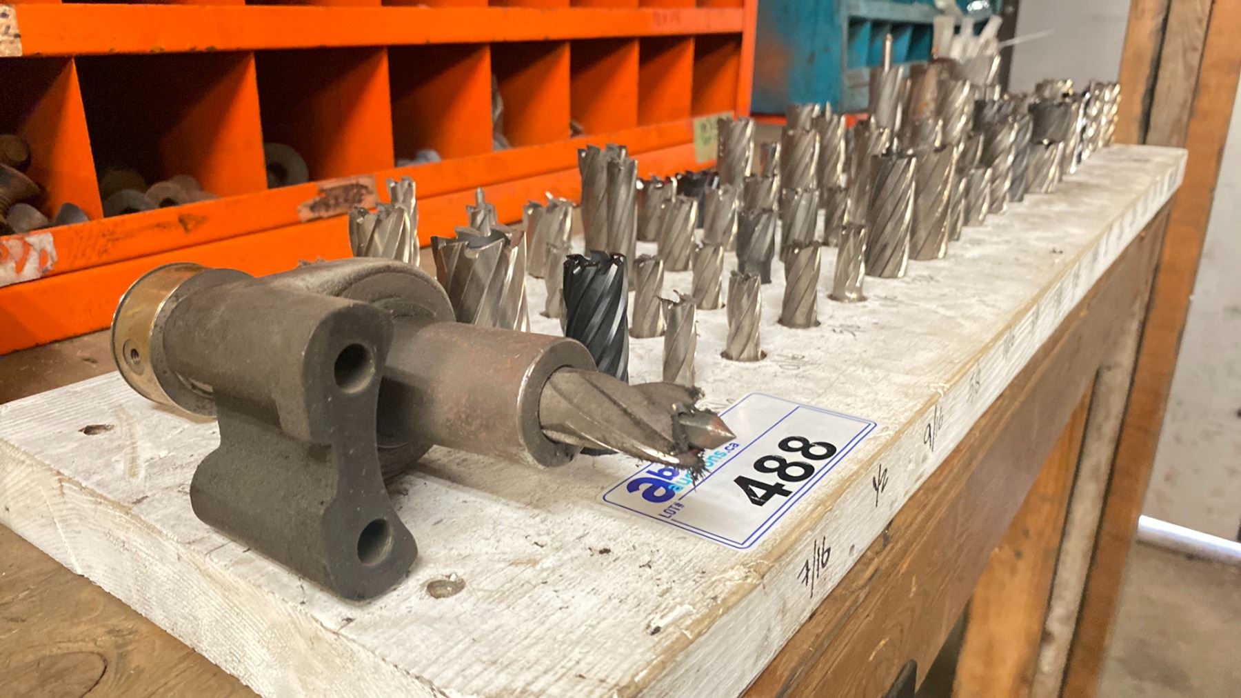 LARGE SET OF ASSORTED SIZE ANNULAR CUTTERS WITH CHUCK ASSEMBLY