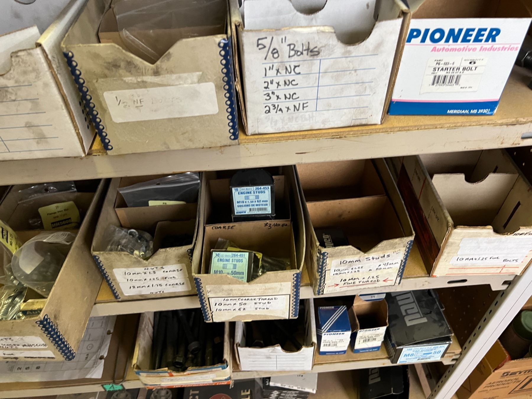 LARGE SHELF LOT OF ASSORTED FASTENERS, NUTS, BOLTS, SNAP RINGS, WASHERS, SPECIALTY SCREWS, OLD CORK VALVE COVER GASKETS, CAT AND CUMMINGS PIECES
