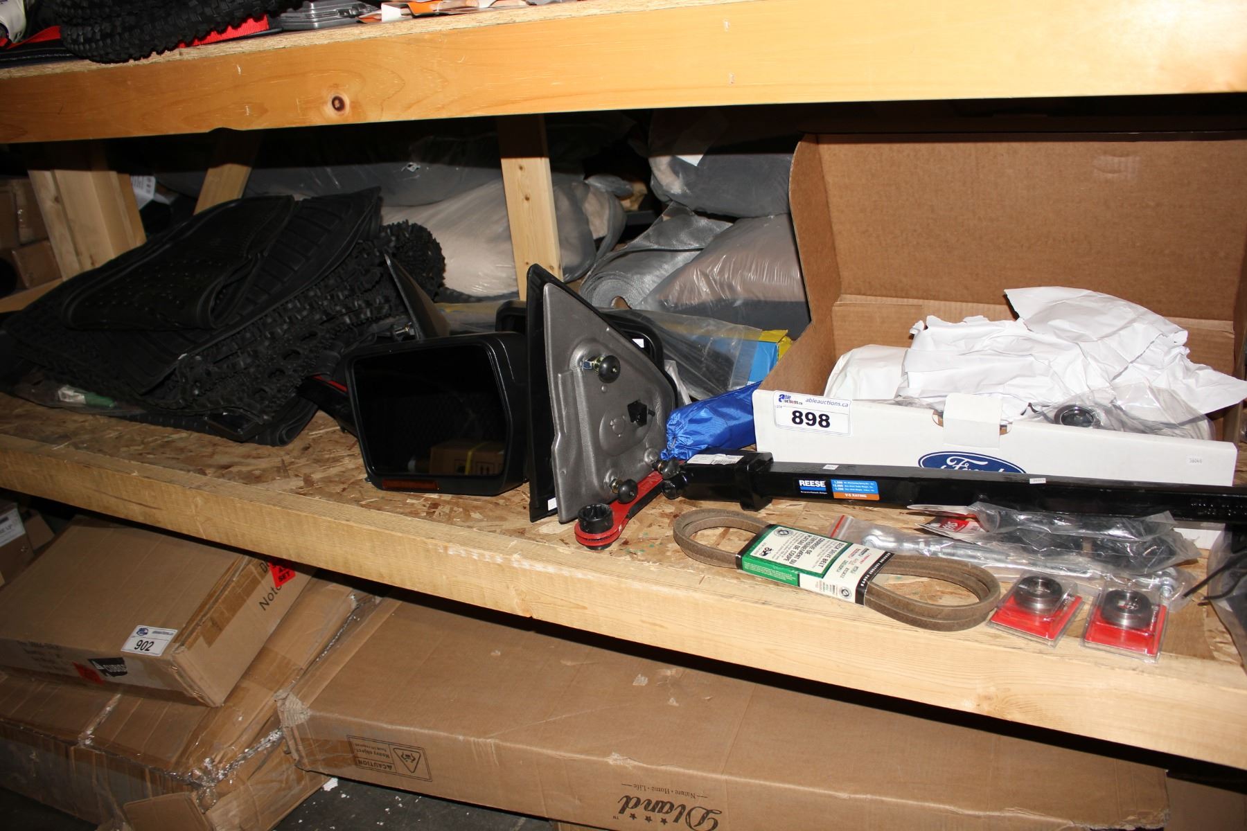 LARGE SHELF LOT OF CAR SUPPLIES INCLUDING TRUCK SIDE MIRRORS, FORD PERFORMANCE PARTS, MATS, LIGHTS