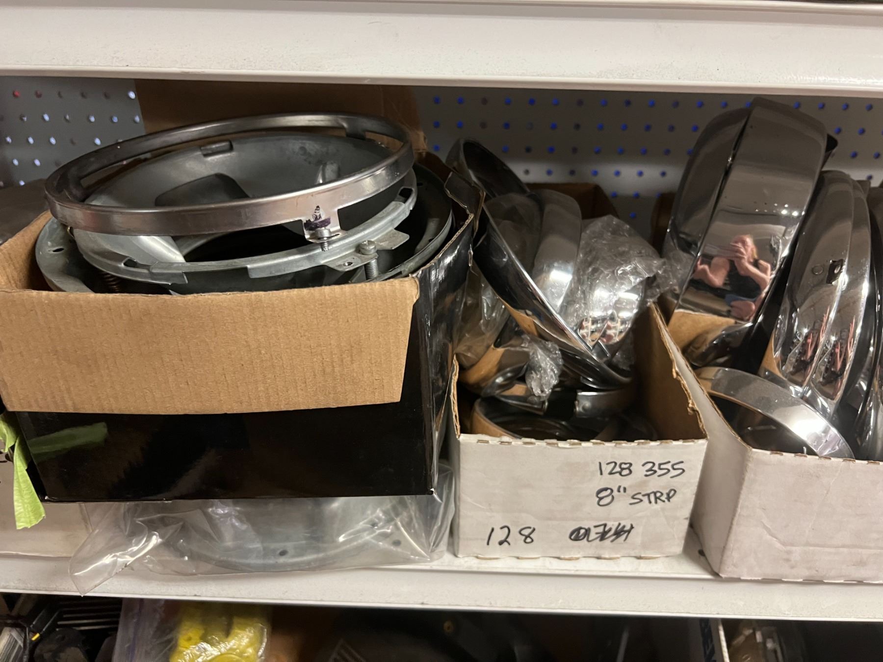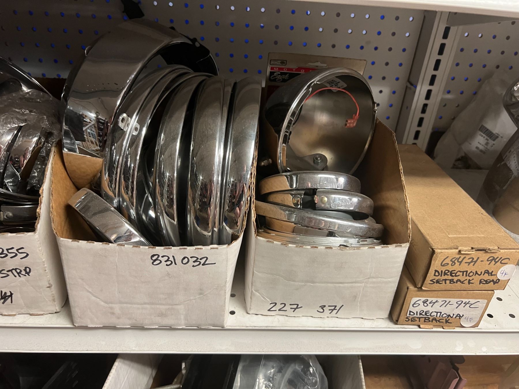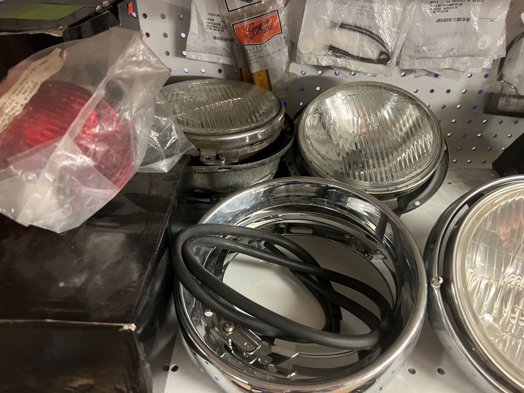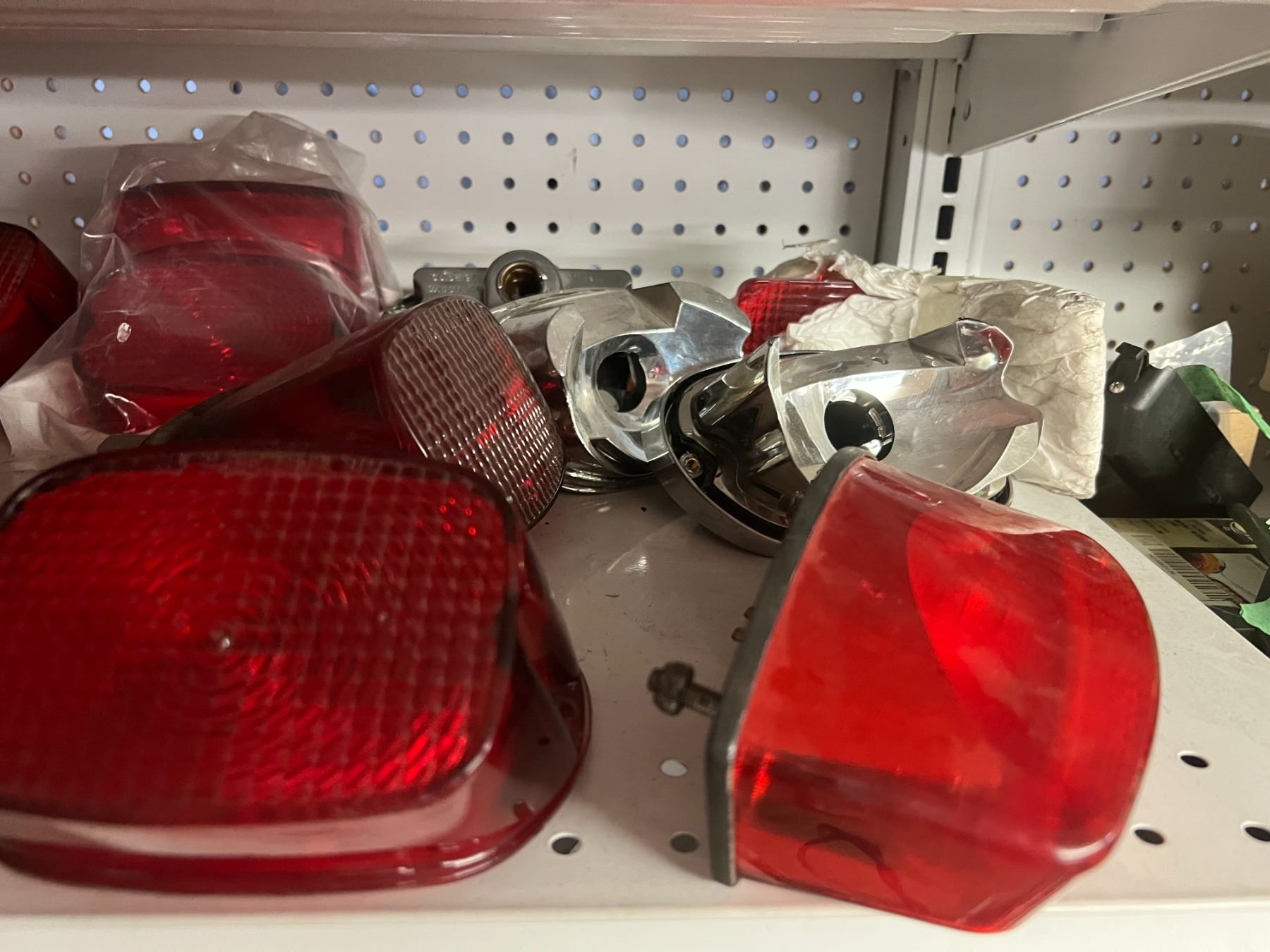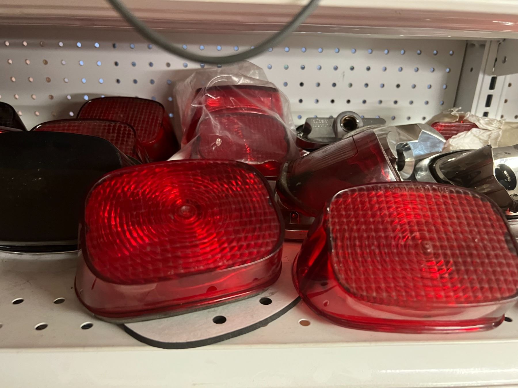 LARGE SHELF LOT OF INVENTORY - TAIL LIGHT LENS, HEAD LIGHTS, LIGHT RINGS, VOLTAGE REGULATOR, SPOT