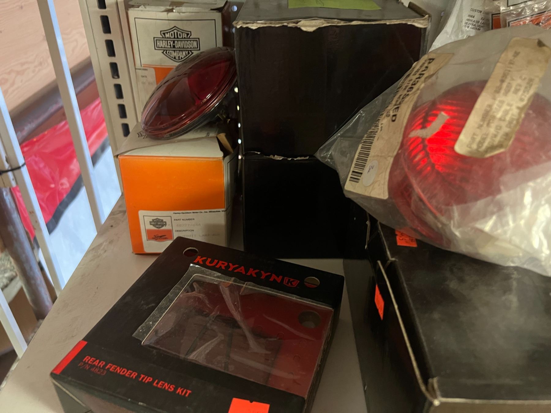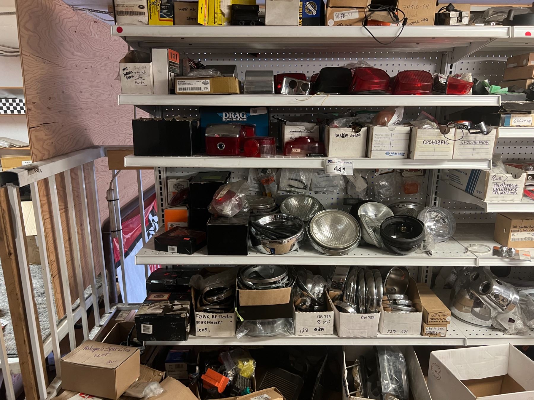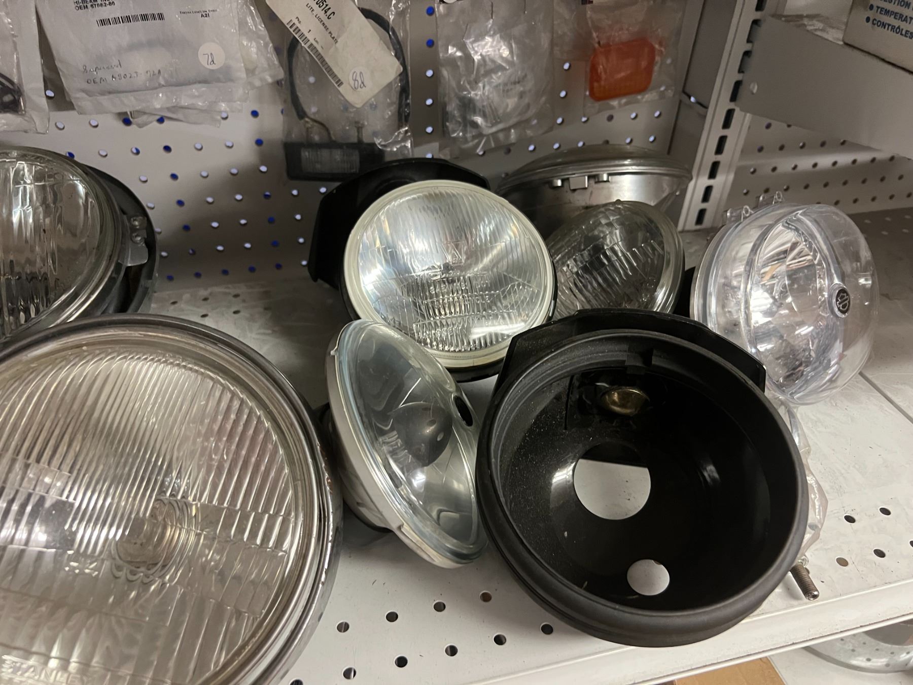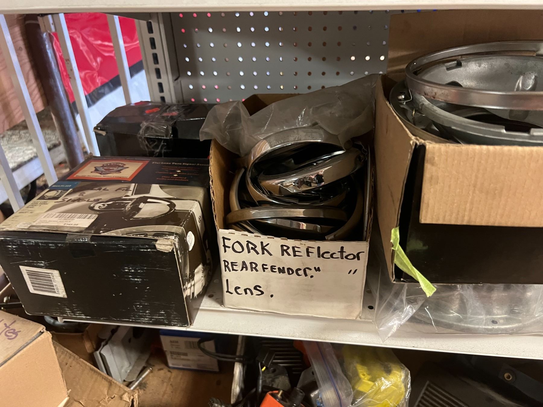 LARGE SHELF LOT OF INVENTORY - TAIL LIGHT LENS, HEAD LIGHTS, LIGHT RINGS, VOLTAGE REGULATOR, SPOT