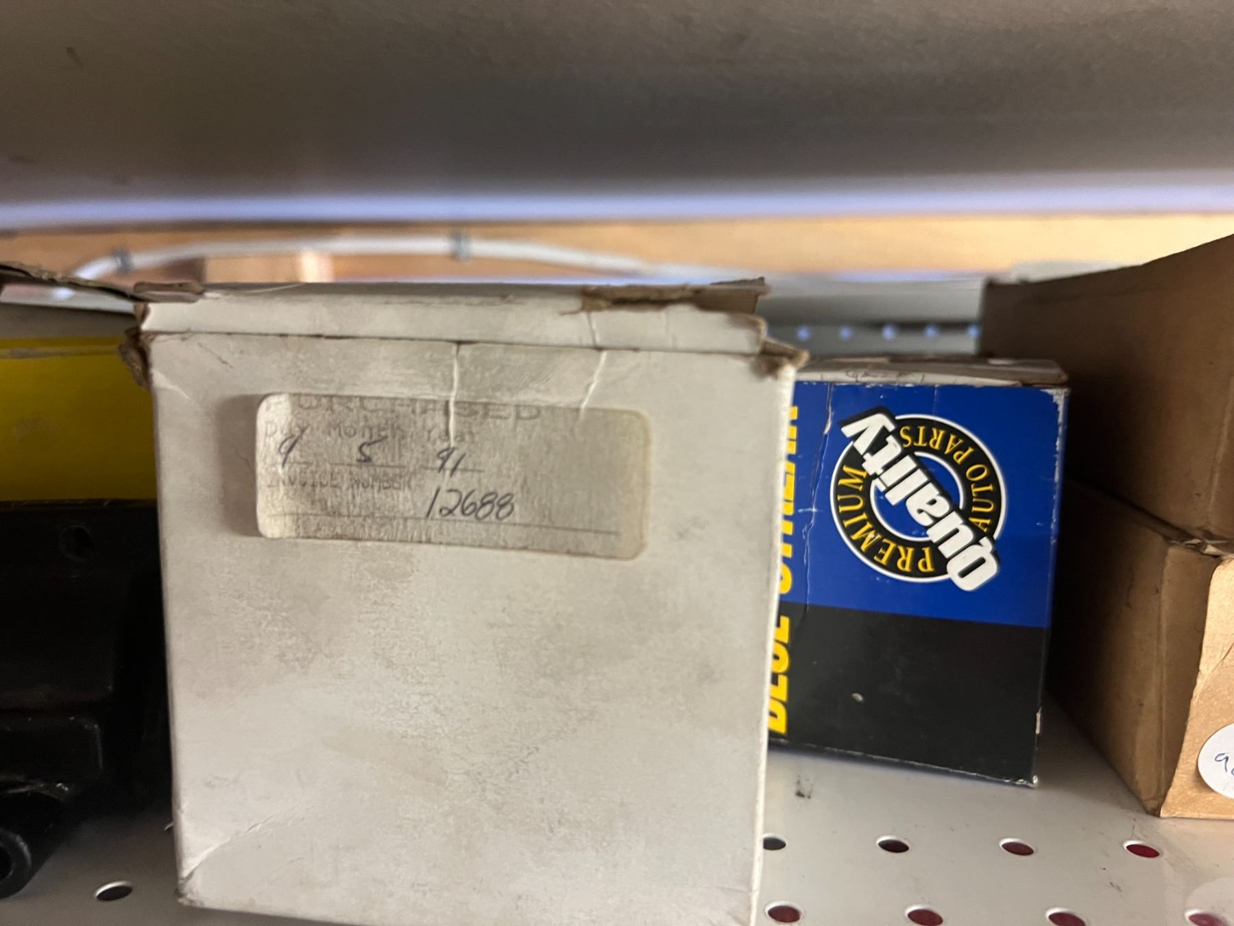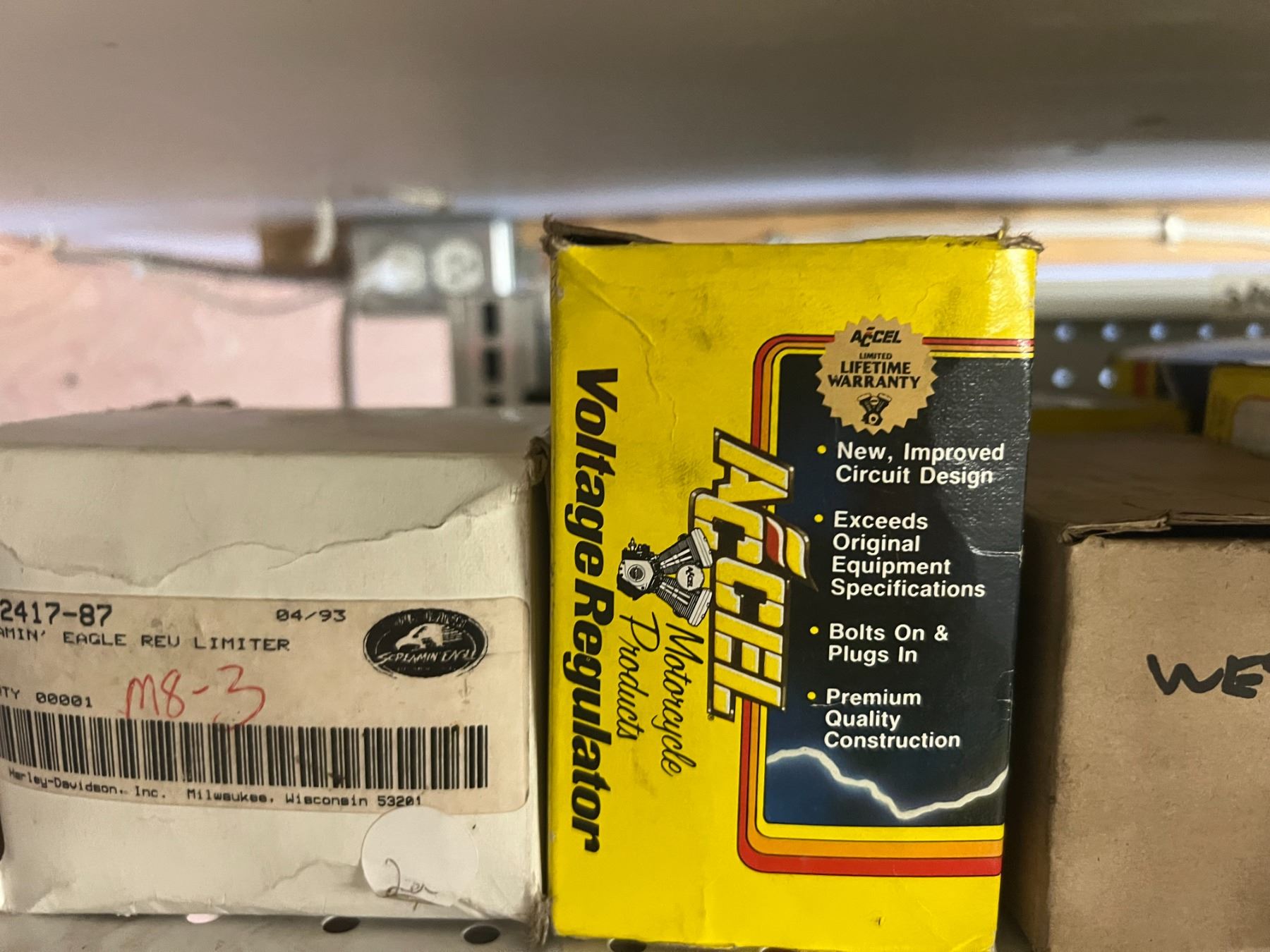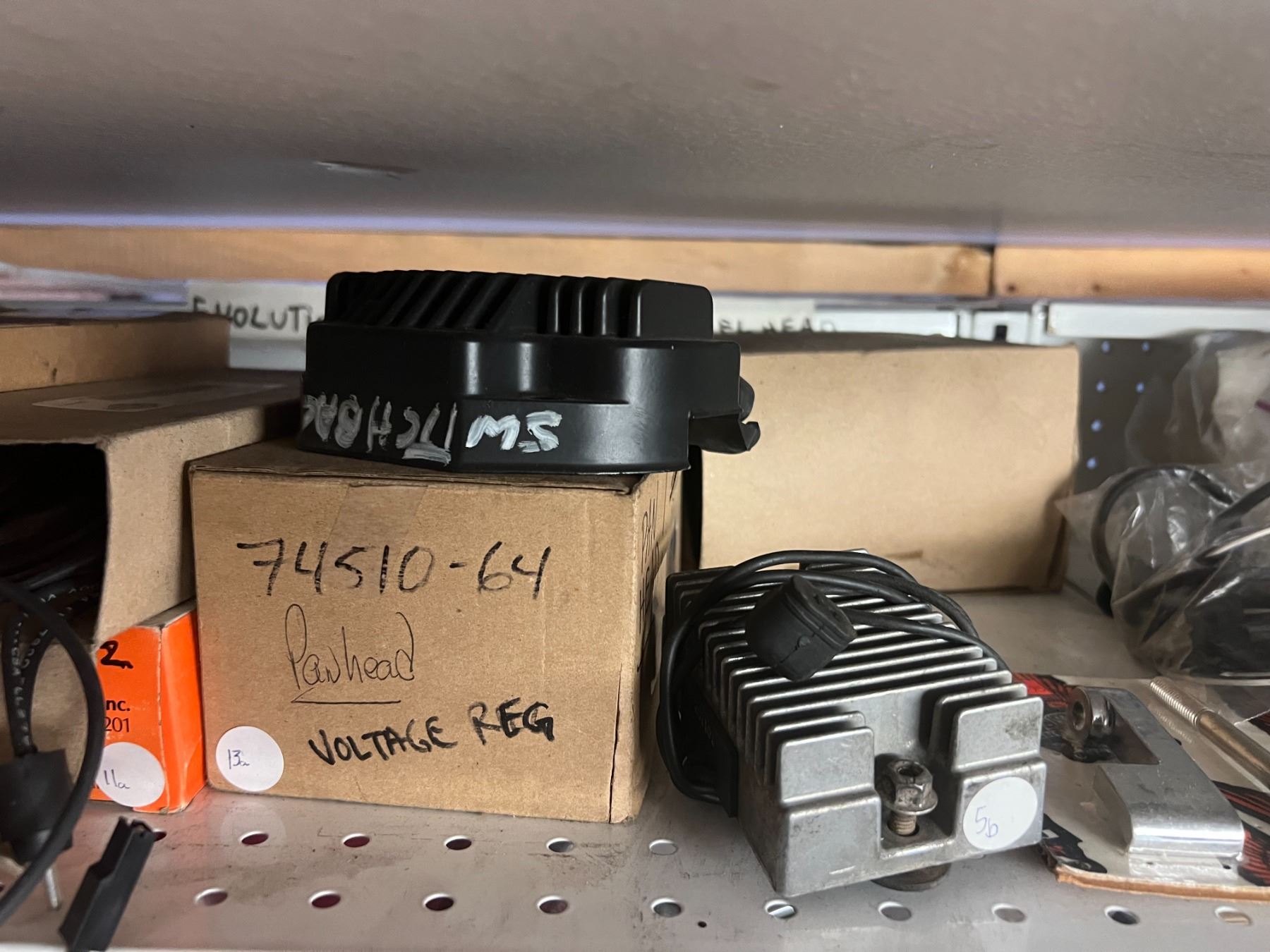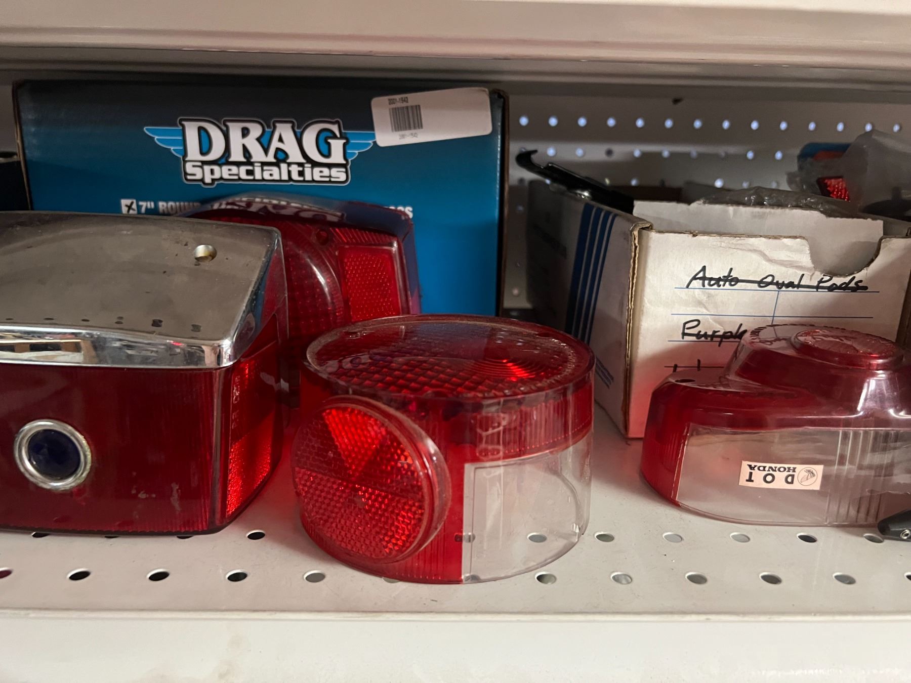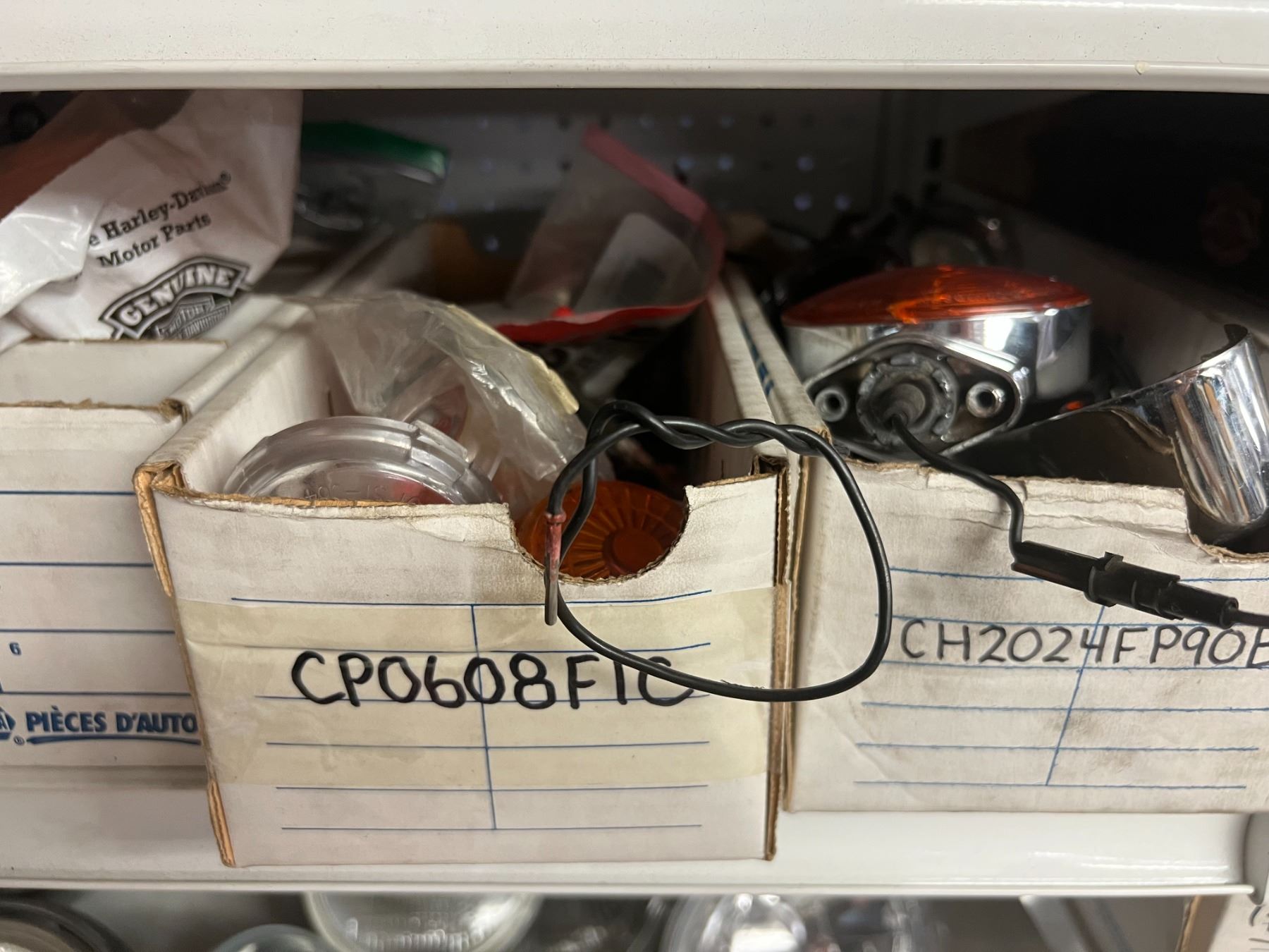LARGE SHELF LOT OF INVENTORY - TAIL LIGHT LENS, HEAD LIGHTS, LIGHT RINGS, VOLTAGE REGULATOR, SPOT