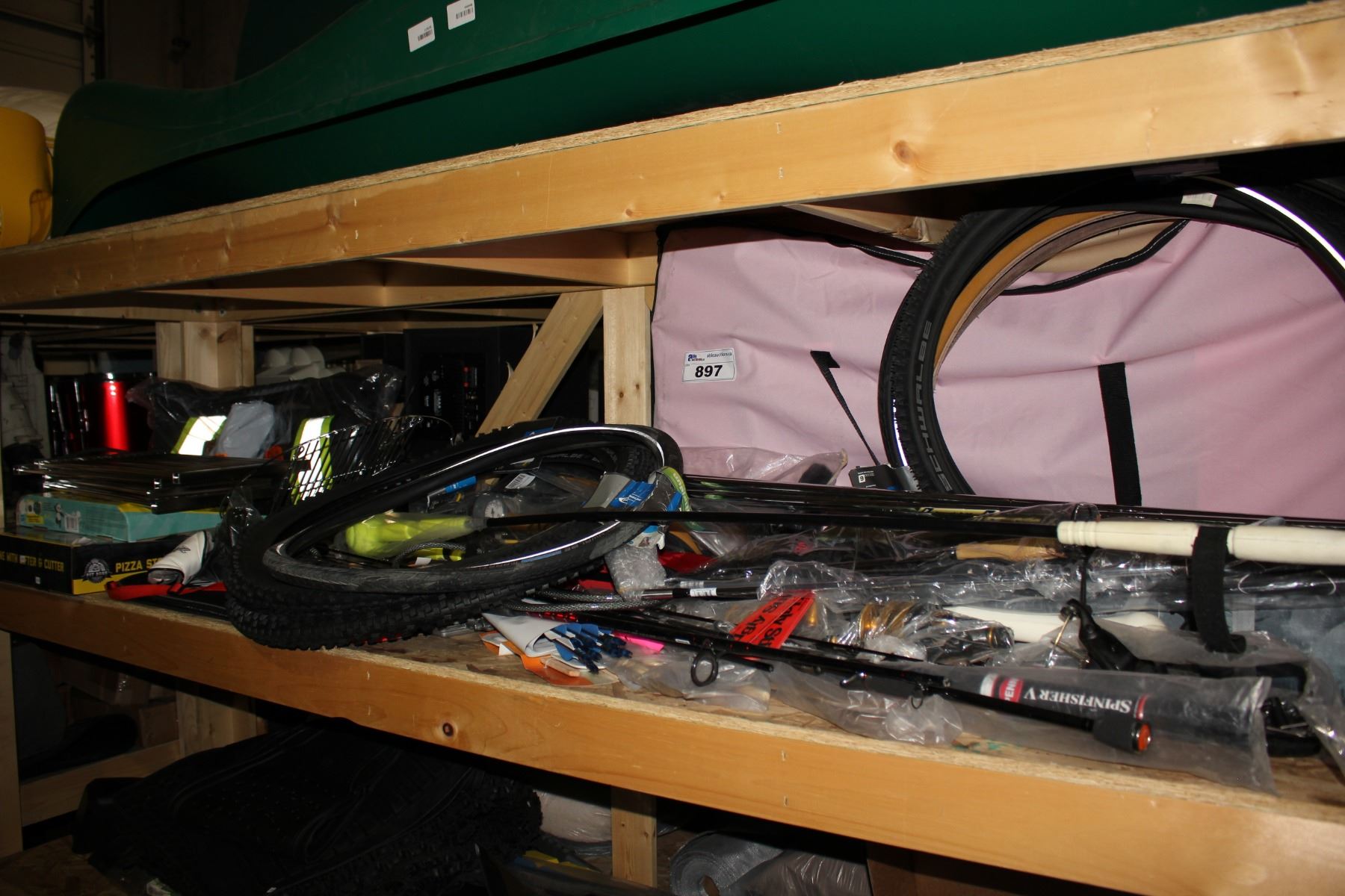 LARGE SHELF LOT OF SPORTING GOODS INCLUDING FISHING RODS, BICYCLE TIRES, ARROWS, GOLF CLUBS AND
