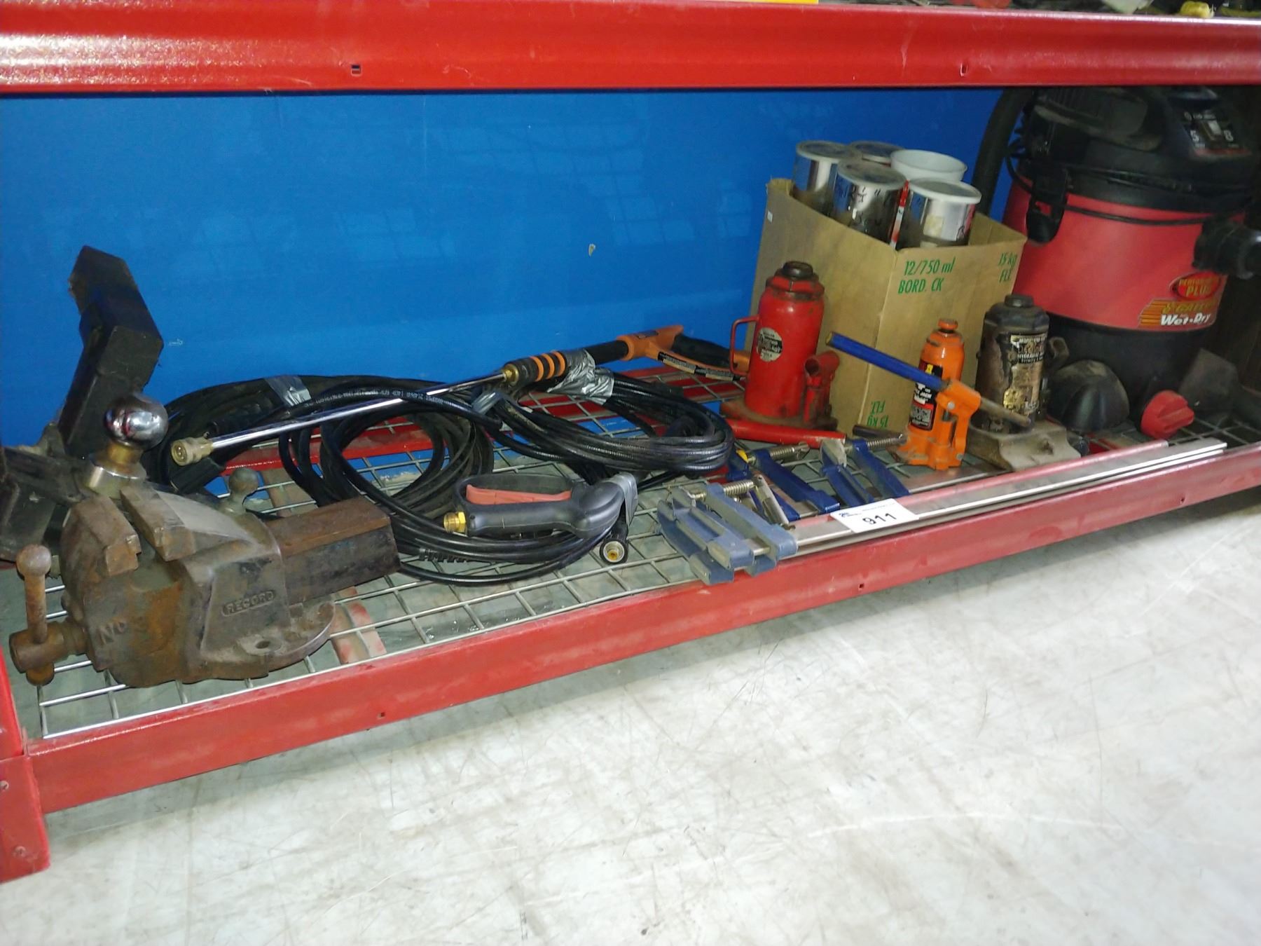 LARGE SHELF OF TOOLS INCLUDING PRESSURE WASH WANDS, SHOP VAC, HOIST, CLAMPS AND MORE