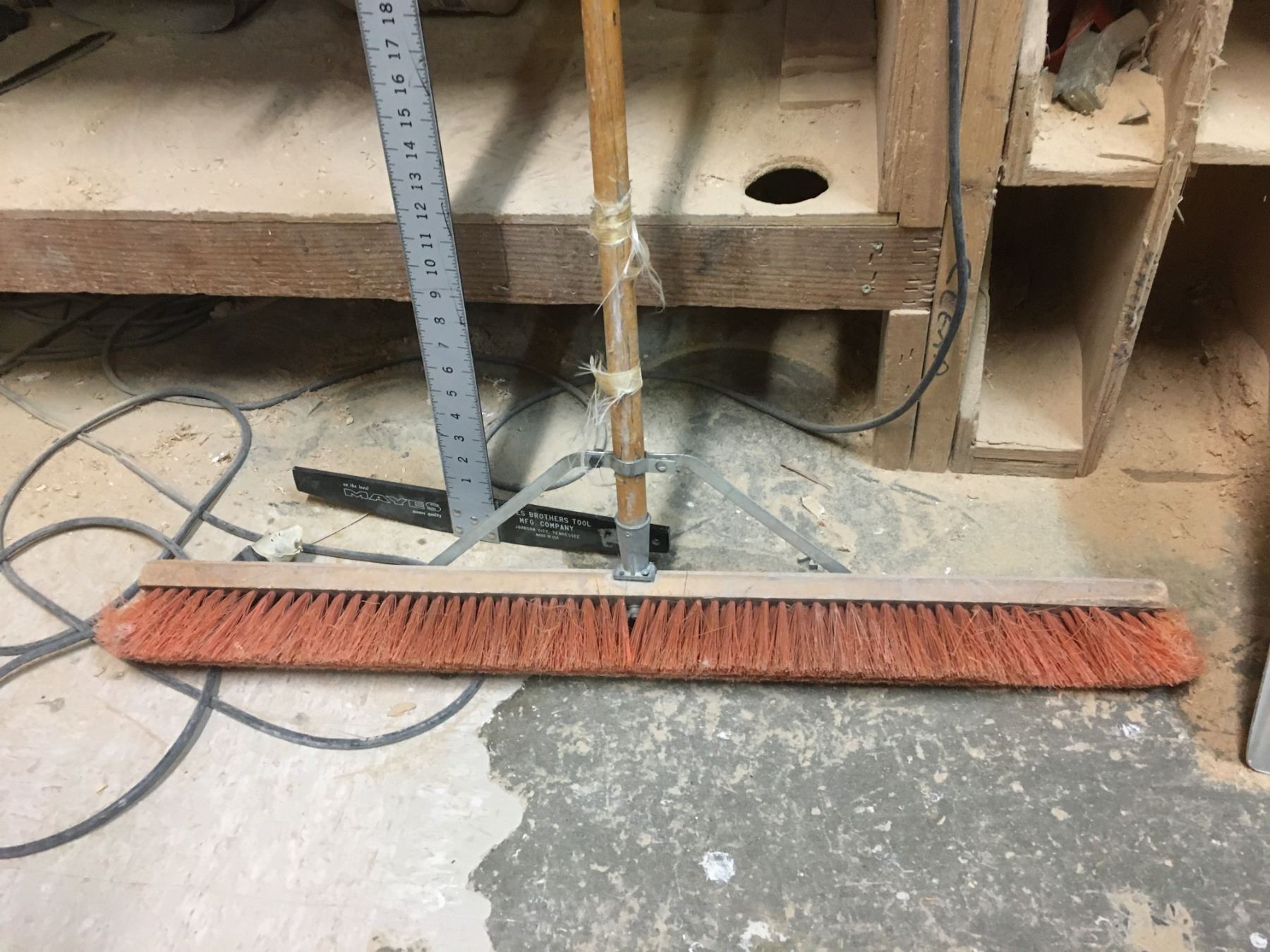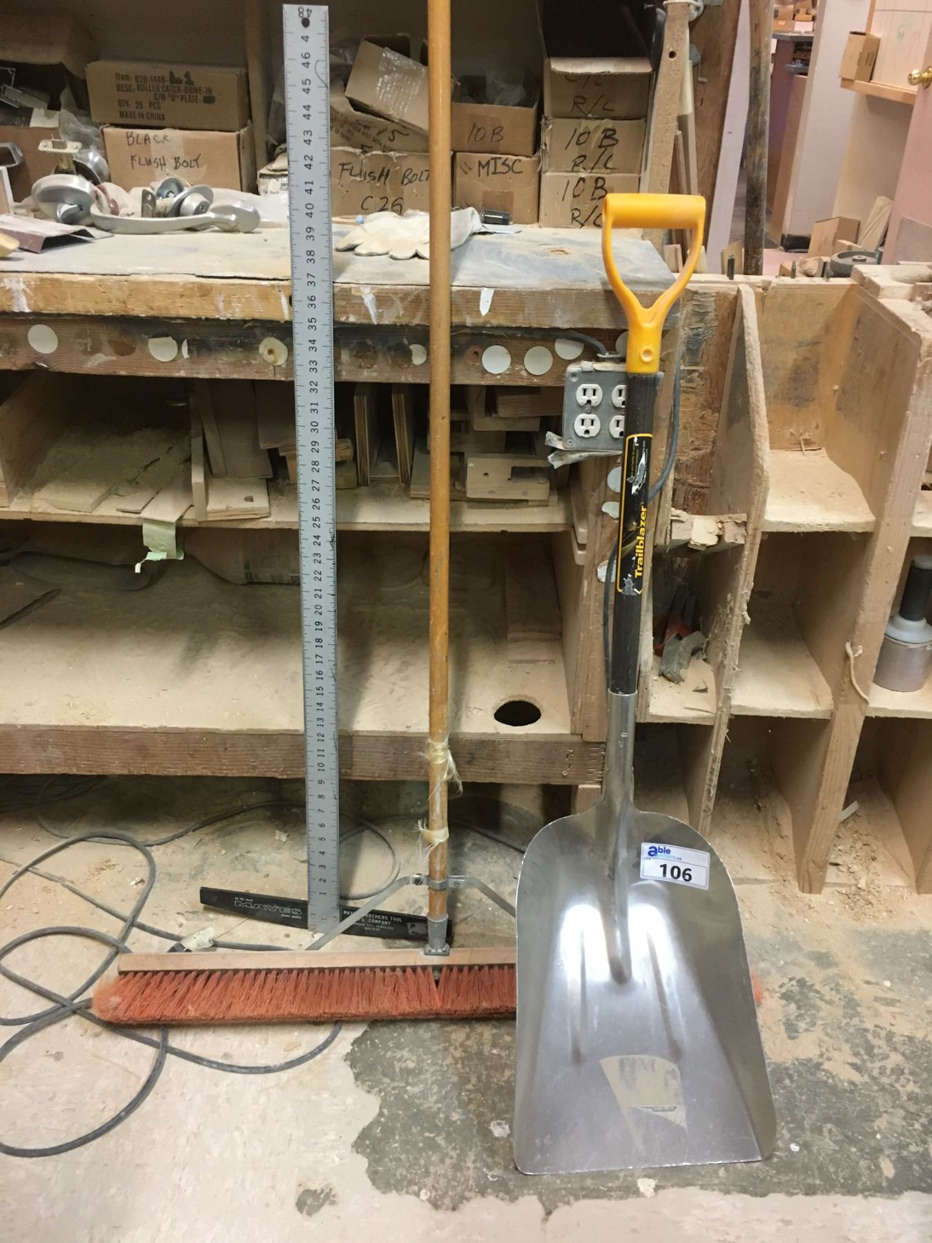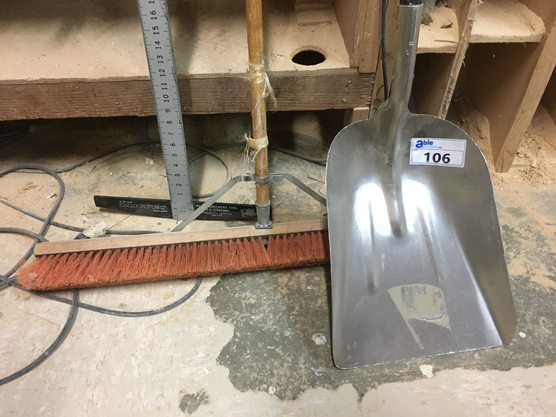 LARGE SHOP BROOM, SHOVEL AND CARPENTERS SQUARE