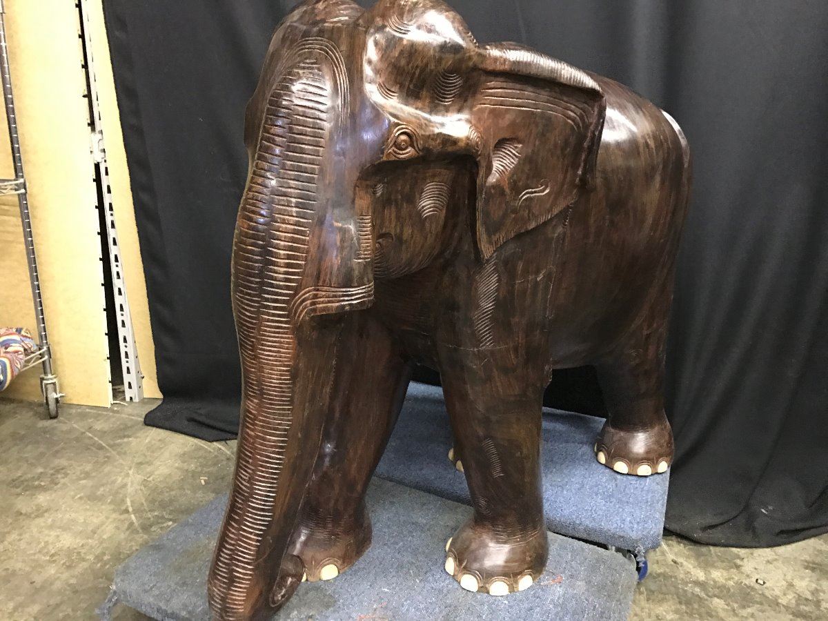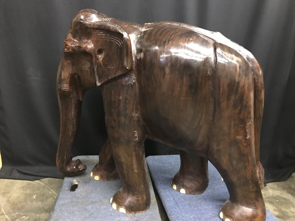 LARGE SOLID EXOTIC WOOD CARVED ELEPHANT. CARVING MEASURES: 36" TALL X 42" LONG X 22" WIDE