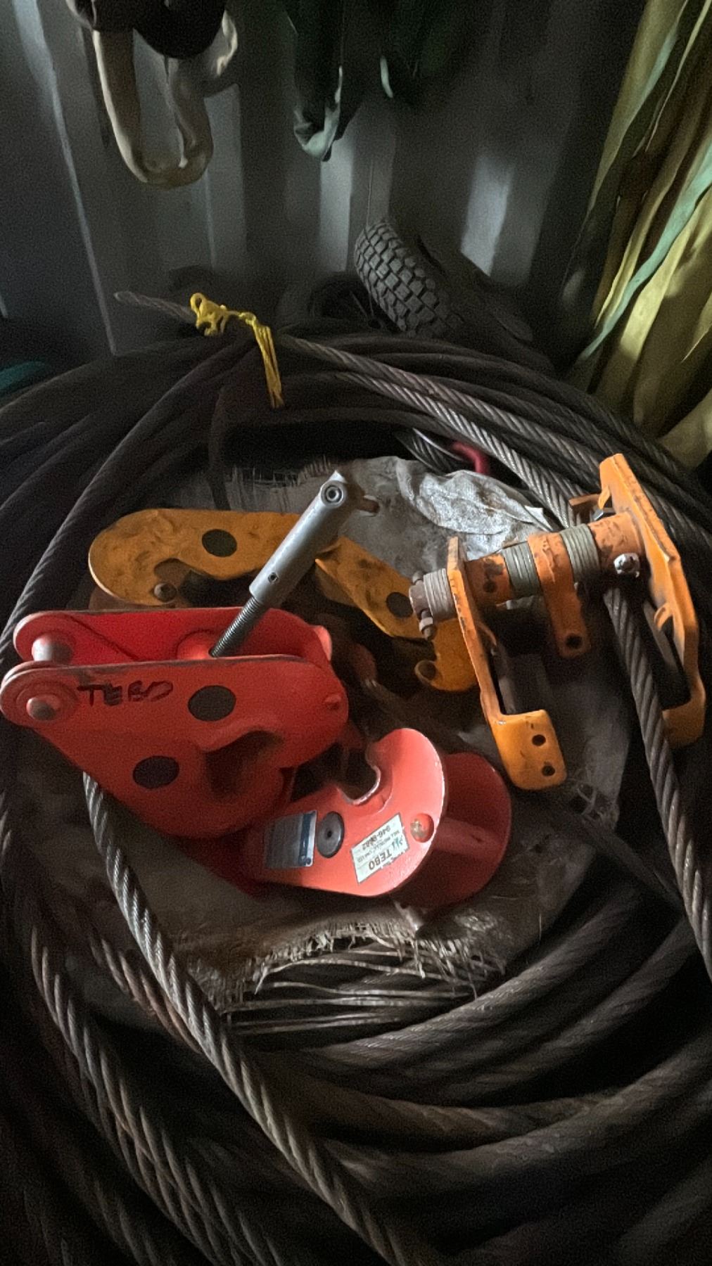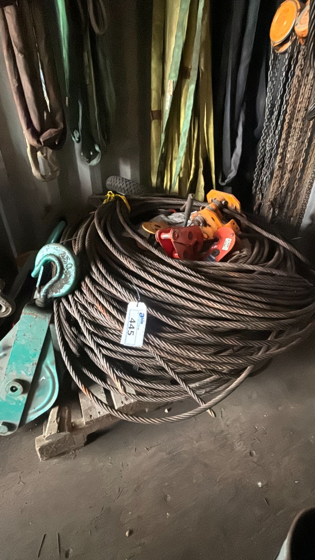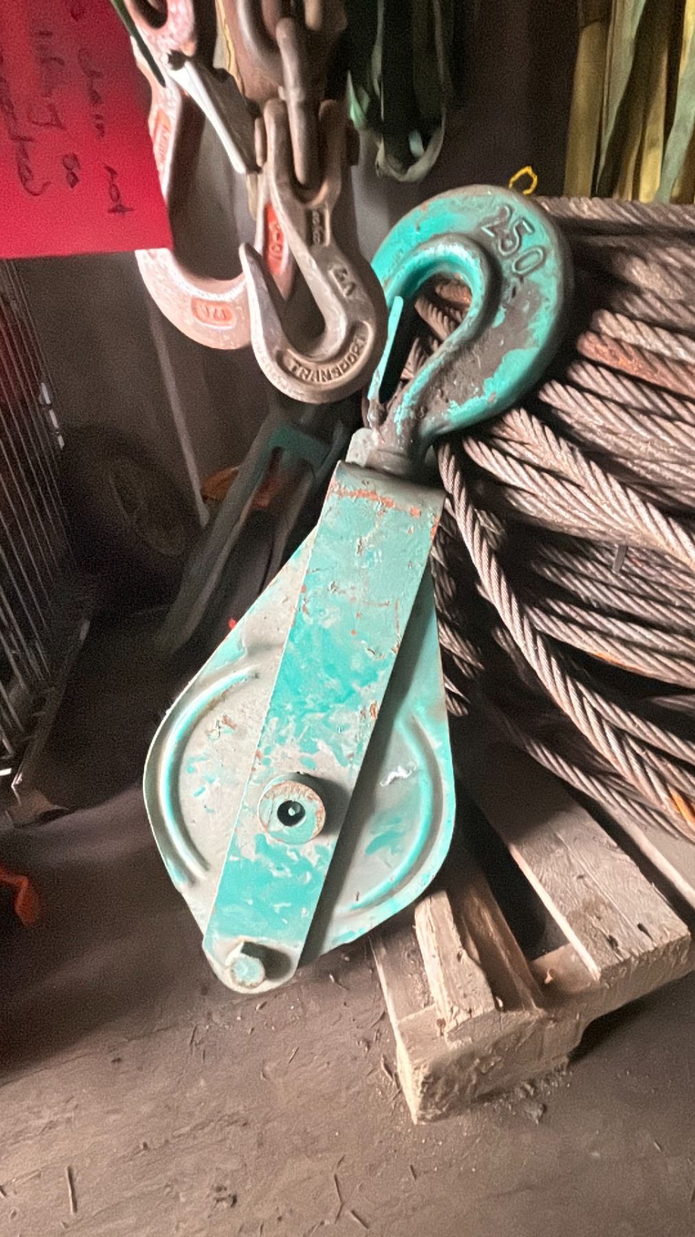 LARGE SPOOL OF 1/2" BRAIDED CABLE LINE WITH ASSORTED GREEN PULLEY LOAD HOOKS, CABLE TROLLEYS & WHEELS