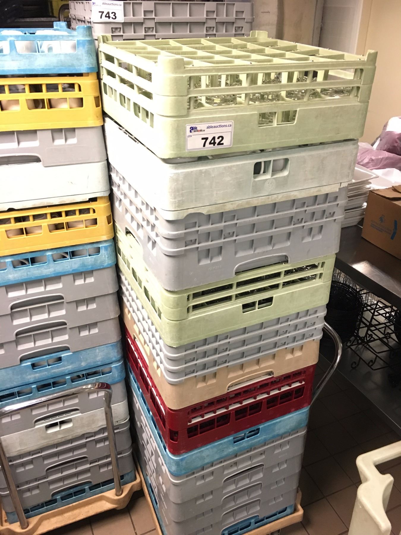 LARGE STACK OF ASSORTED BANQUET GLASSWARE/CERAMIC, COMES WITH TRAYS AND CART