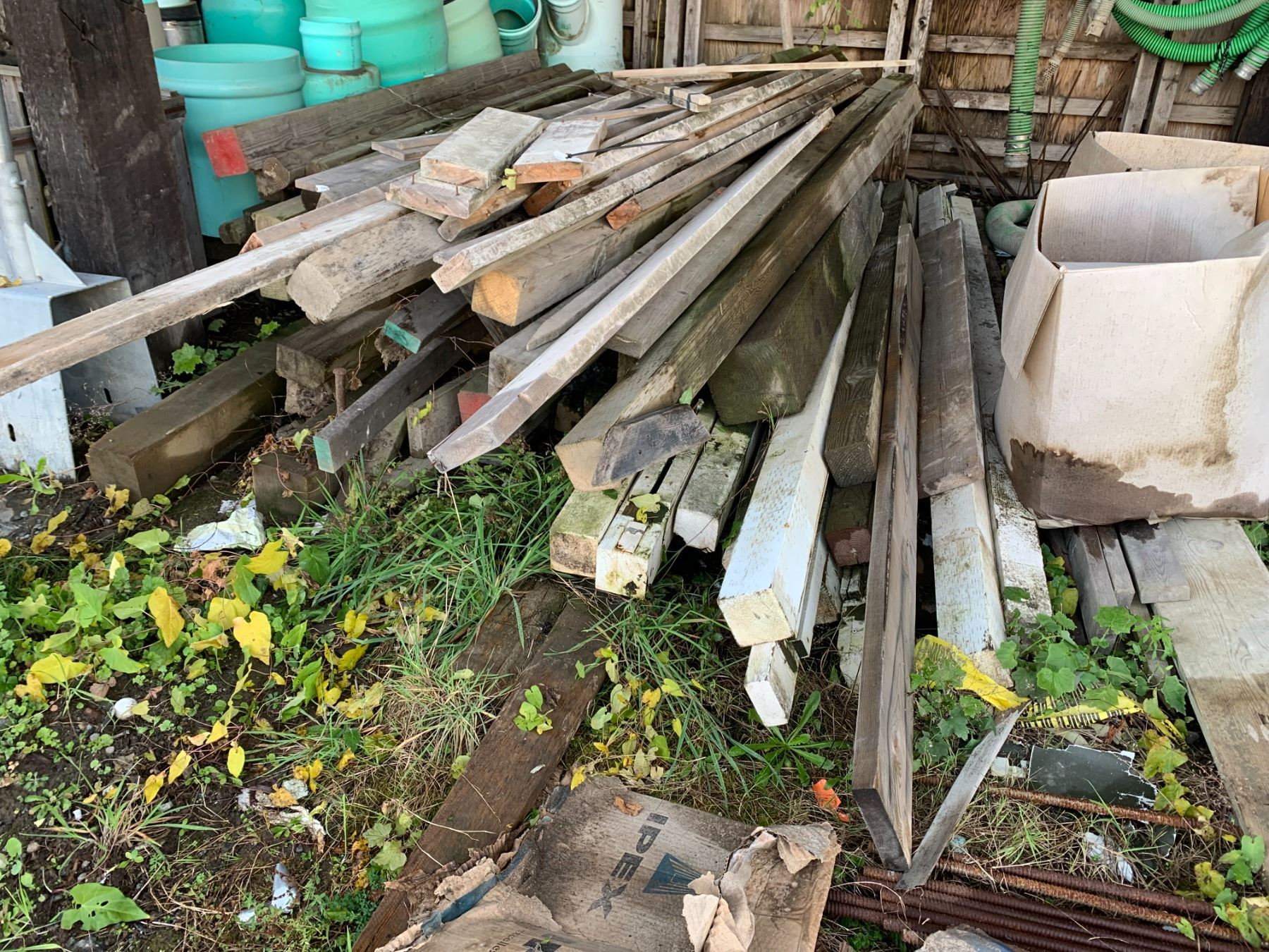 LARGE STACK OF ASSORTED LUMBER INCLUDING BEAMS & WEATHER TREATED POSTS