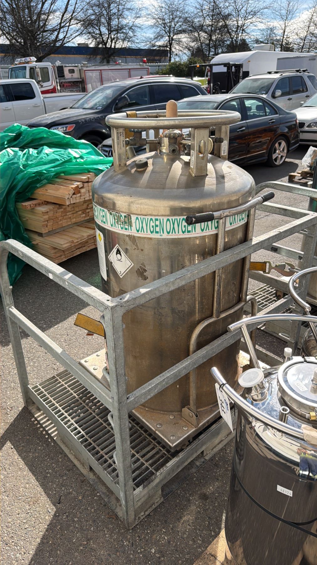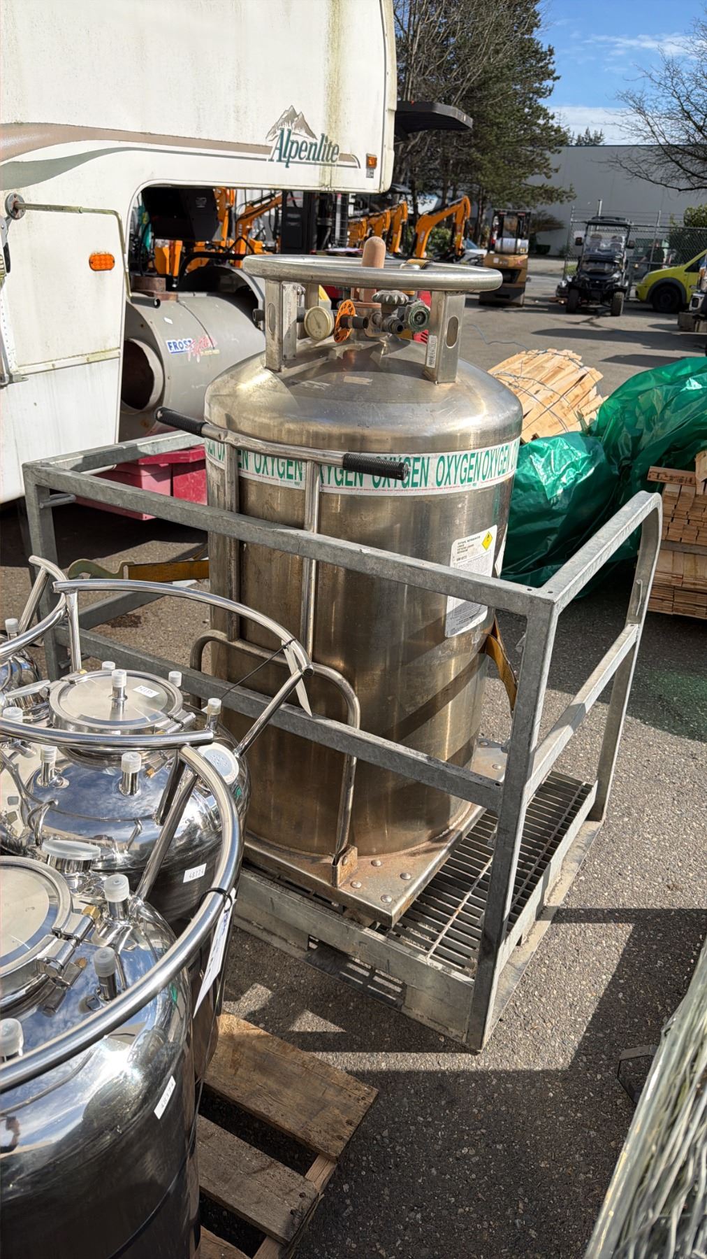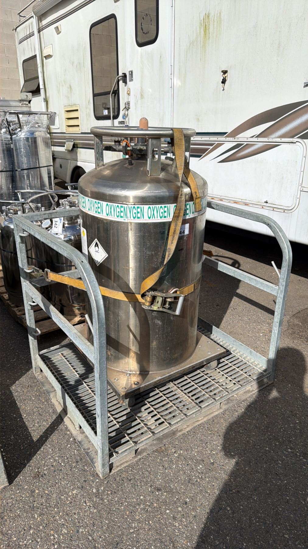 LARGE STAINLESS STEEL MOBILE LABORATORY OXYGEN TANK ON GALVANIZED MAN LIFT PLATFORM